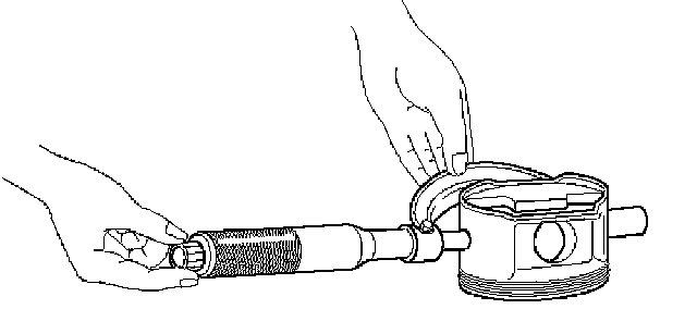 3. Insert the new pin into the piston and rotate it. If the pin rotates smoothly with no backlash, the clearance is normal. If there is backlash or roughness, measure the clearance. If the clearance exceeds the specified limit, the piston must be replaced.