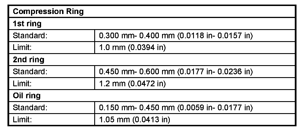 2. Measure the clearance between the piston ring groove and the piston ring with a feeler gauge. If the piston ring groove/piston ring clearance exceeds the specified limit, the piston must be replaced.