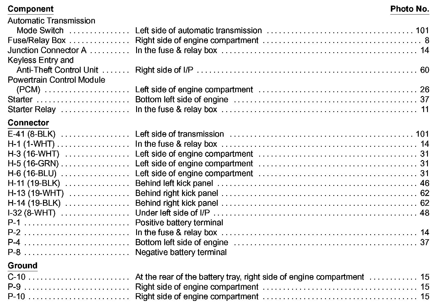 Starting System Component Location Index: