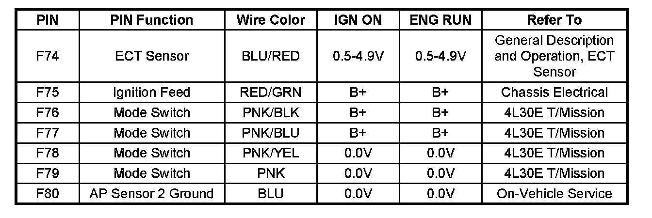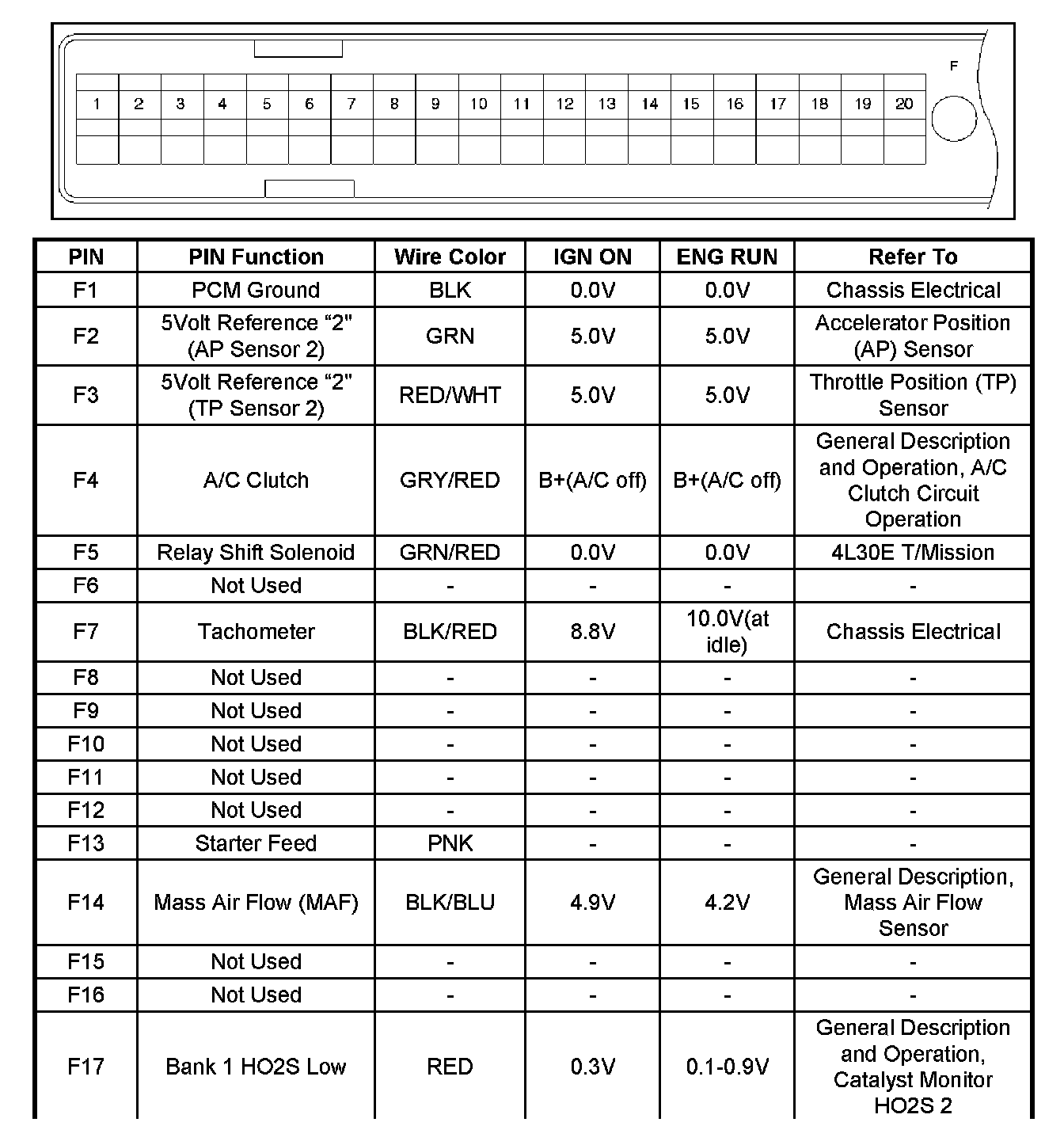 PCM Pinout Table, 80 - Way Blue Connector - Row "F1 - 20" Part 2: