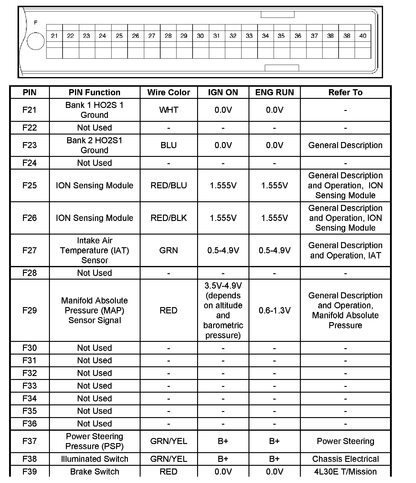 PCM Pinout Table, 80 - Way Blue Connector - Row "F20 - 40" Part 2: