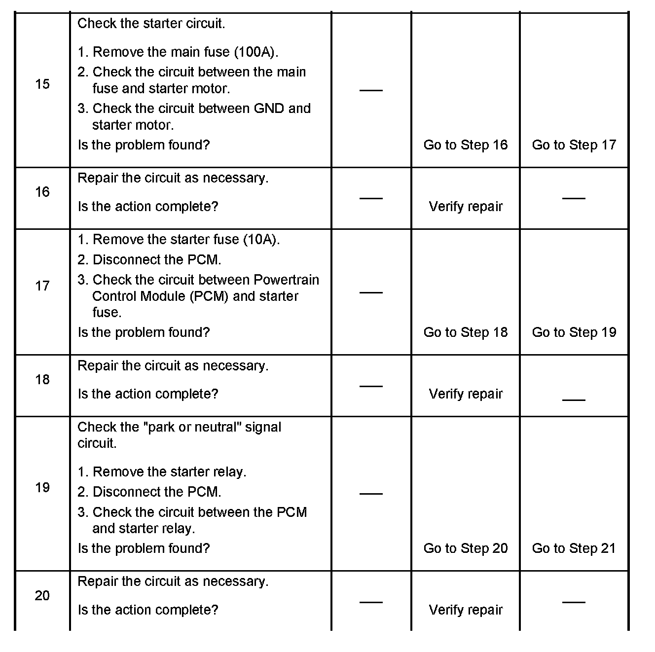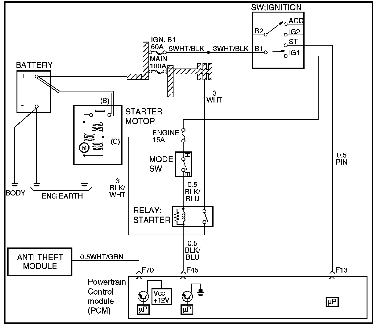 The starter control system is controlled by the Power Train Control Module (PCM). The PCM monitors the starter switch signal ("START" position) and MODE switch (park or neutral) signal. The PCM is operated by the ignition switch. Ignition feed voltage is supplied to the MODE switch and starter relay through the engine fuse. The PCM turns the starter relay through the engine fuse. The PCM turns the starter relay "ON" by grounding the starter relay driver circuit.