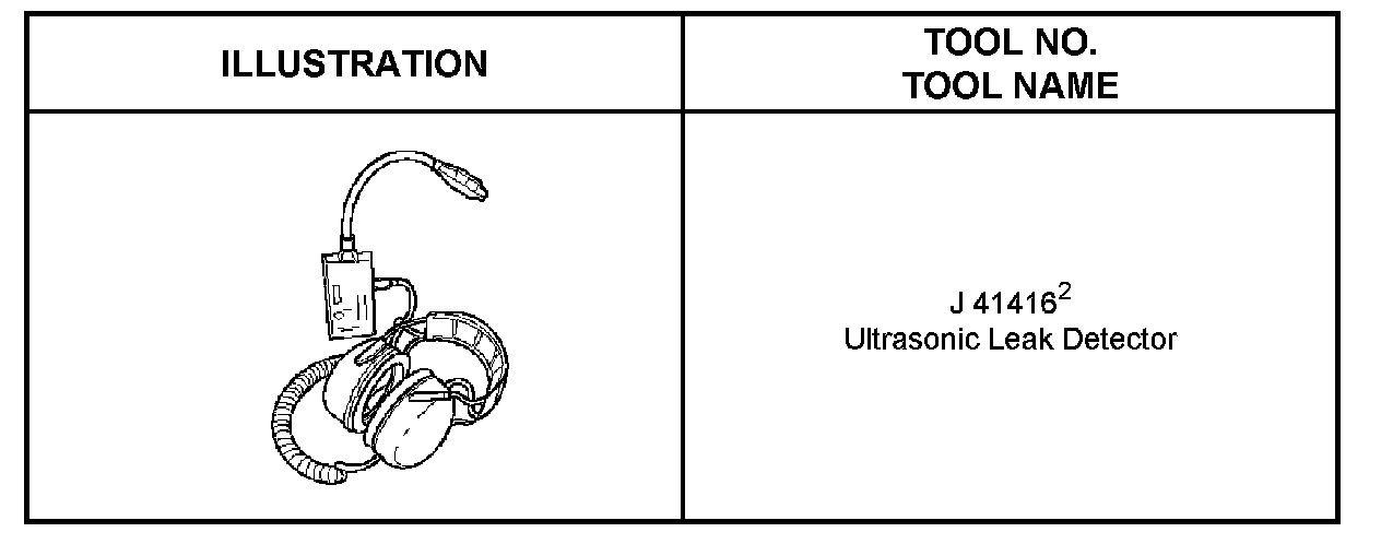 2. J 41416 Ultrasonic Leak Detector is a microprocessor-based device used to detect leaks in the enhanced evaporative emission control system. The evaporative system is pressurized to 30 inches of water using the J 41413 EVAP Pressure/Purge Diagnostic System. Small leaks in the EVAP system will emit sound at a high frequency undetectable by a human ear but detectable with the J 41416. The technician traces along the evaporative system and can pinpoint leaks due to corroded lines, cracked hoses, or a damaged EVAP component. The detector includes a high quality set of headphones to block out surrounding shop noise and the LED sensitivity meter allows a visual reference for locating leaks in conjunction with the audio output heard through the headphones. Powered by (1) nine volt battery.