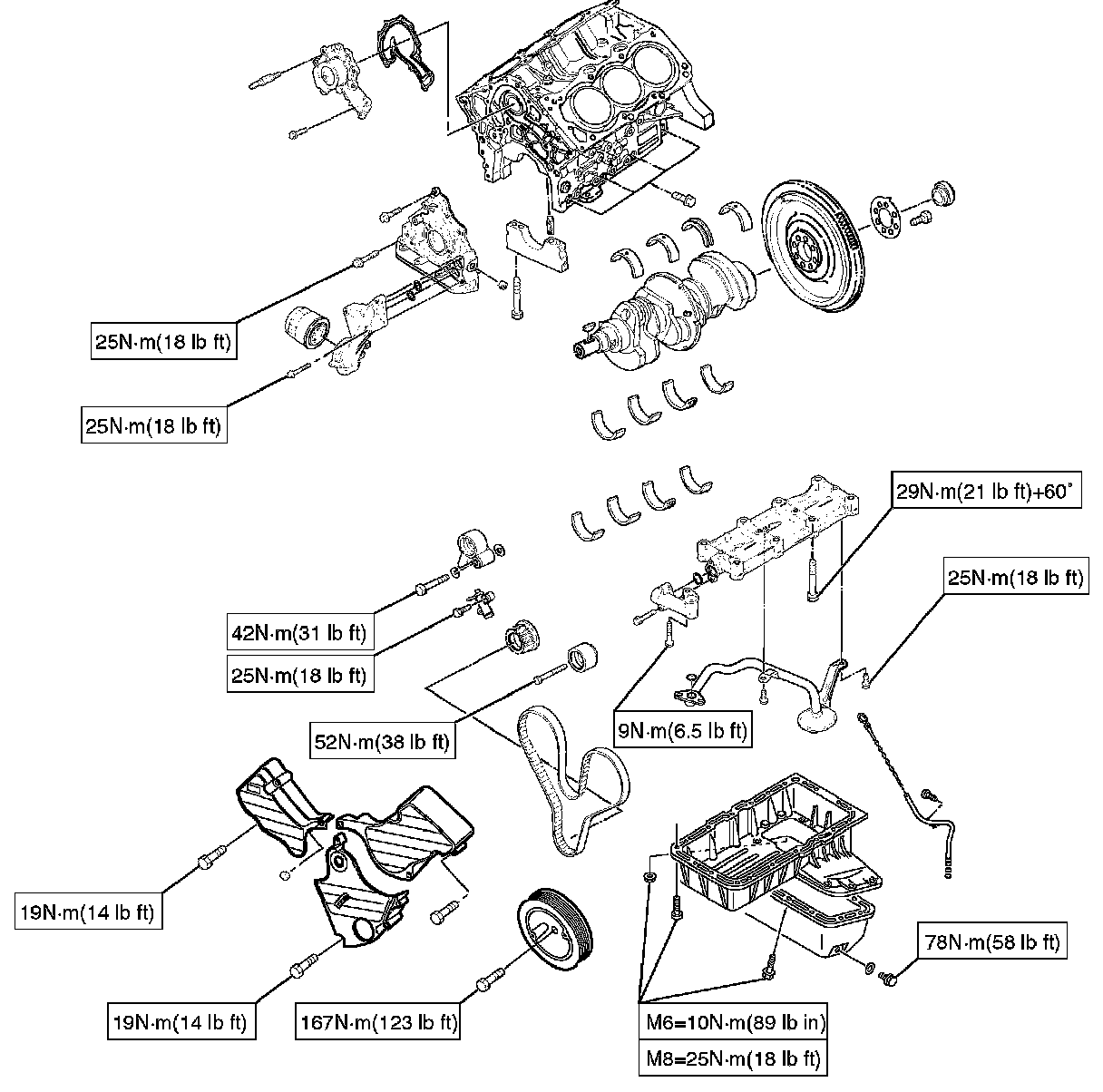 , Timing pulley, timing belt cover, Oil pump, Oil gallery, Oil