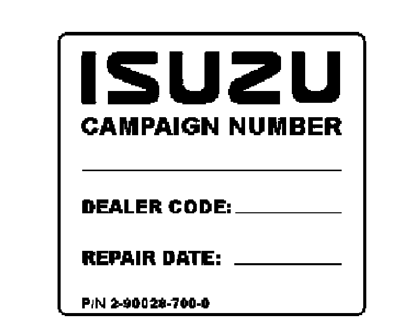 Affix the campaign label P/N 2-90028-700-0 adjacent to the manufacturer's identification label located inside the driver's door. Using a ballpoint pen, fill in the label with campaign number XXX-XXX, Isuzu dealer code and repair date.