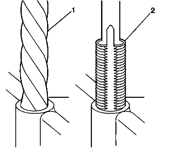 11. Apply threadlock J 42385-109 (1), or equivalent to the insert OD threads (2).