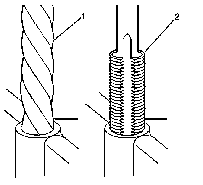 5. Using a tap wrench (2), tap the threads of the drilled hole.