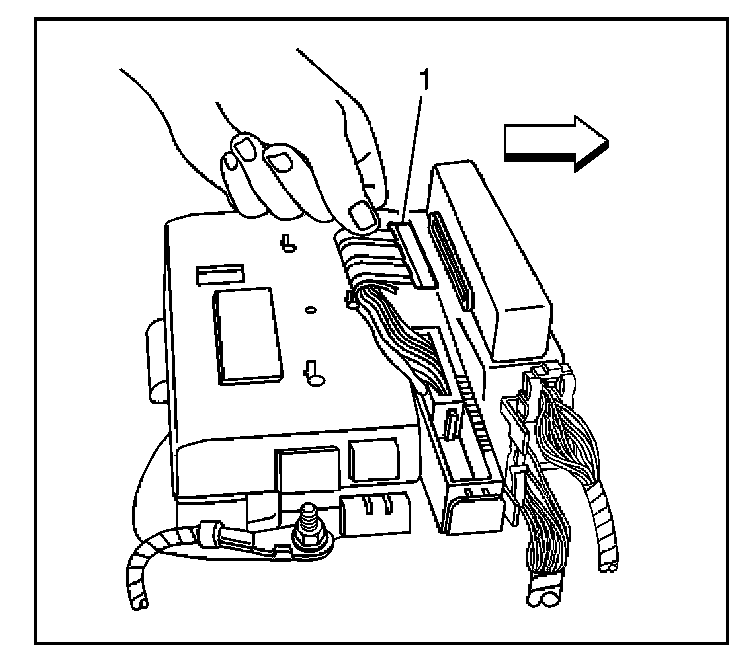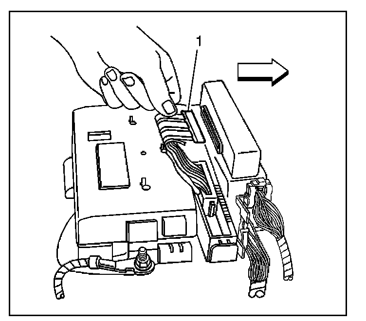 6. Disconnect the 40-way flex electrical connector (1) from the BCM.
