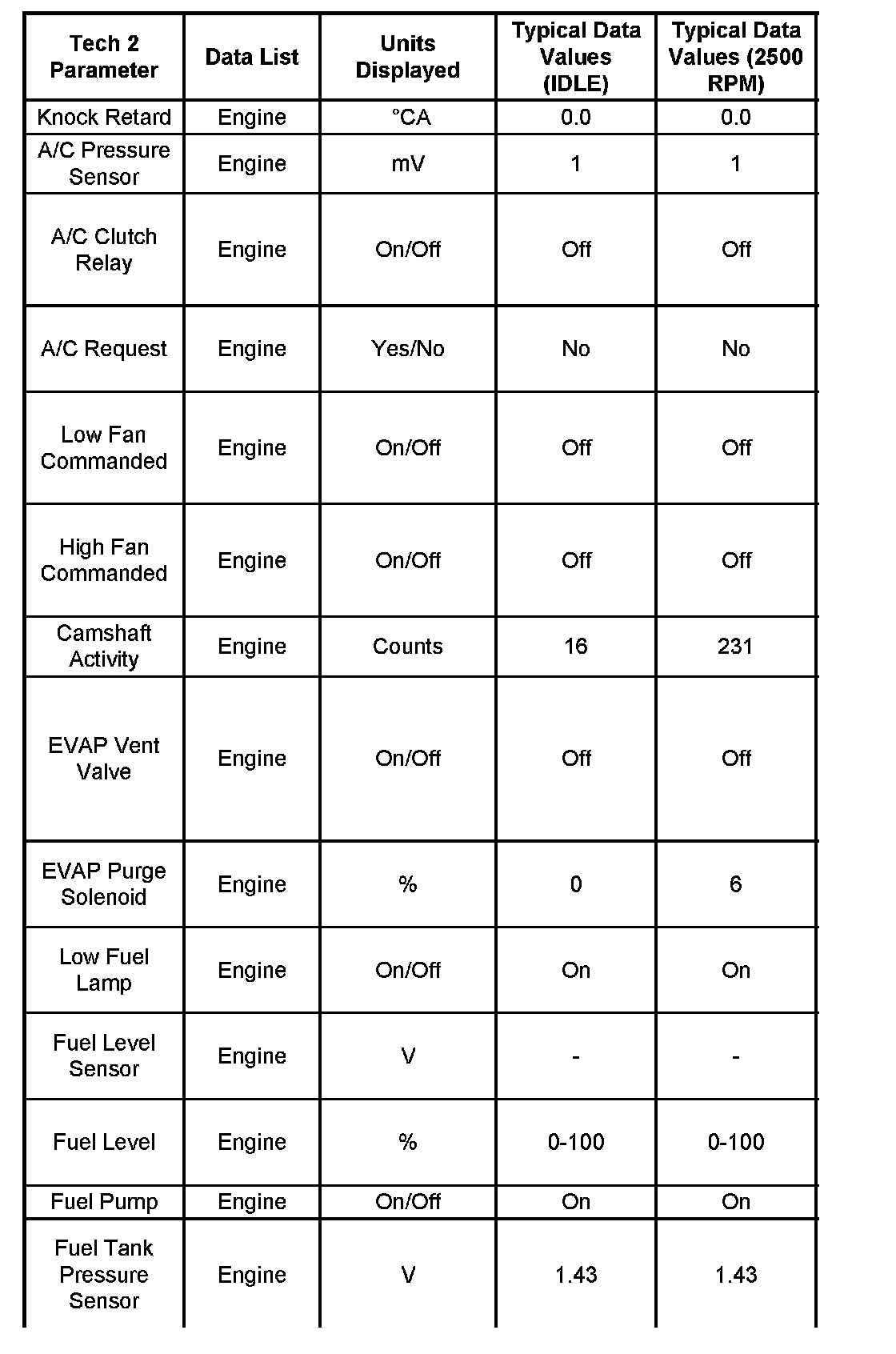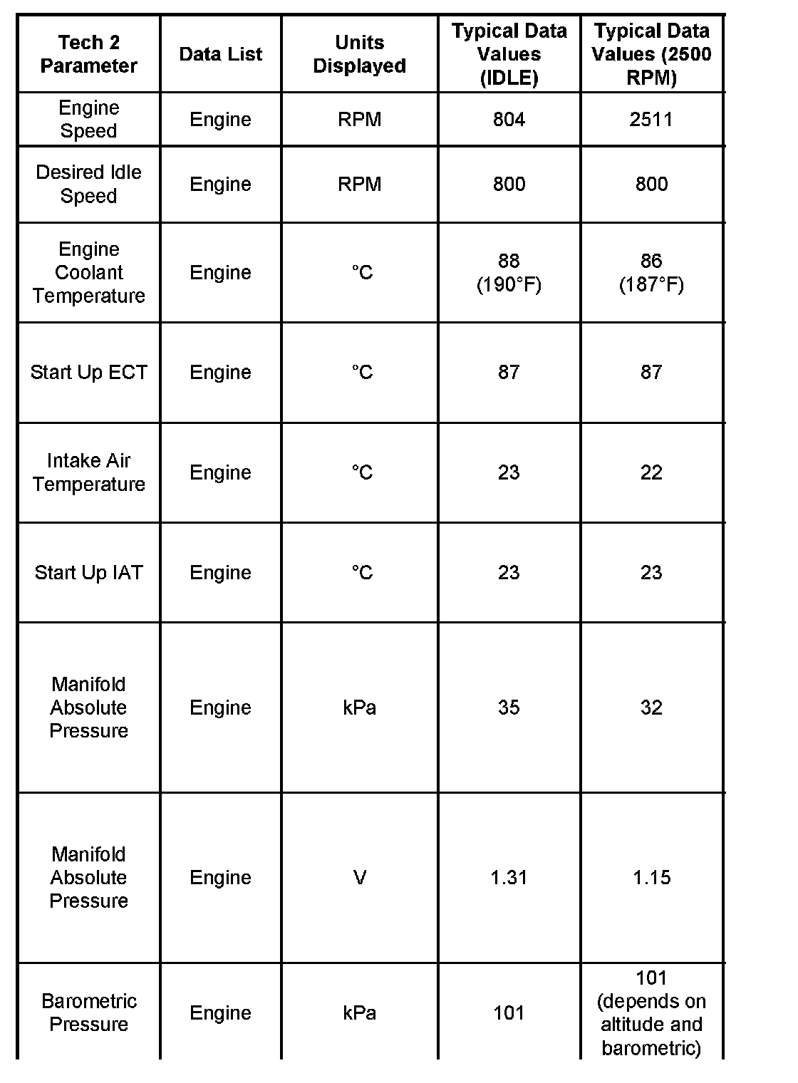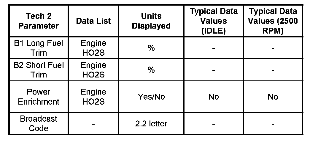 Use the Typical Scan Data Values Table only after the On-Board Diagnostic System Check has been completed, no DTC(s) were noted, and you have determined that the on-board diagnostics are functioning properly. Tech 2 values from a properly-running engine may be used for comparison with the engine you are diagnosing. The typical scan data values represent values that would be seen on a normally-running engine.
