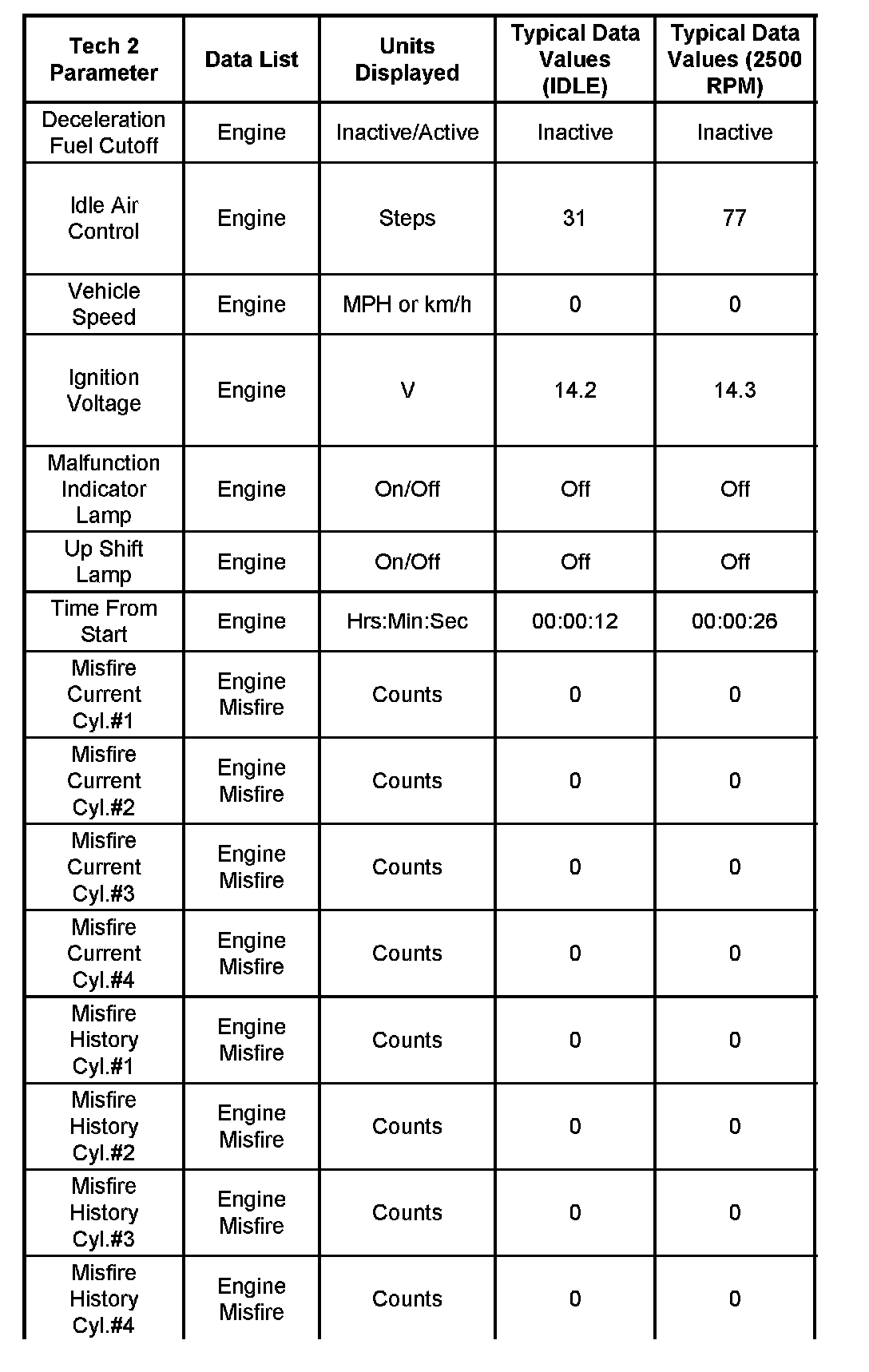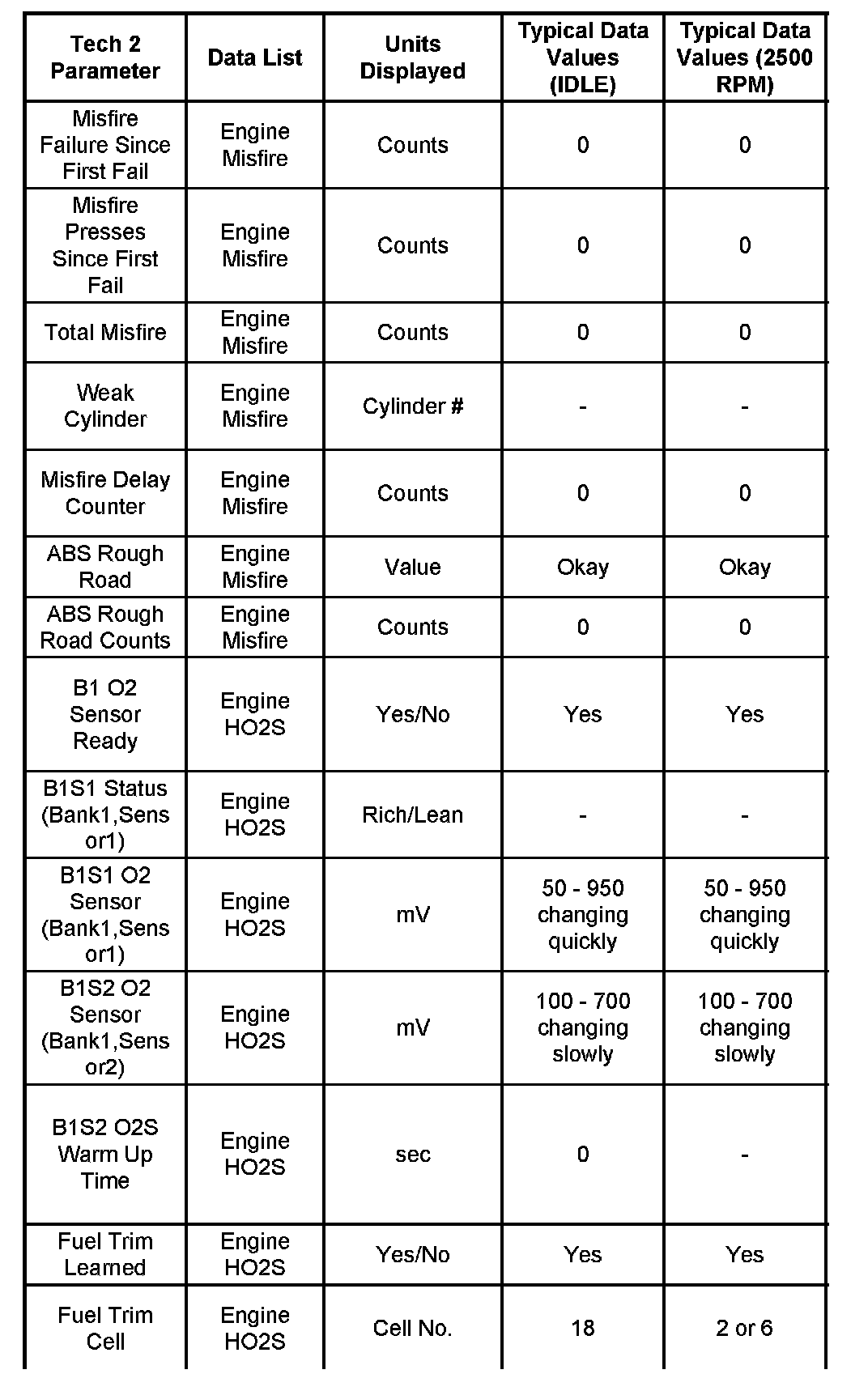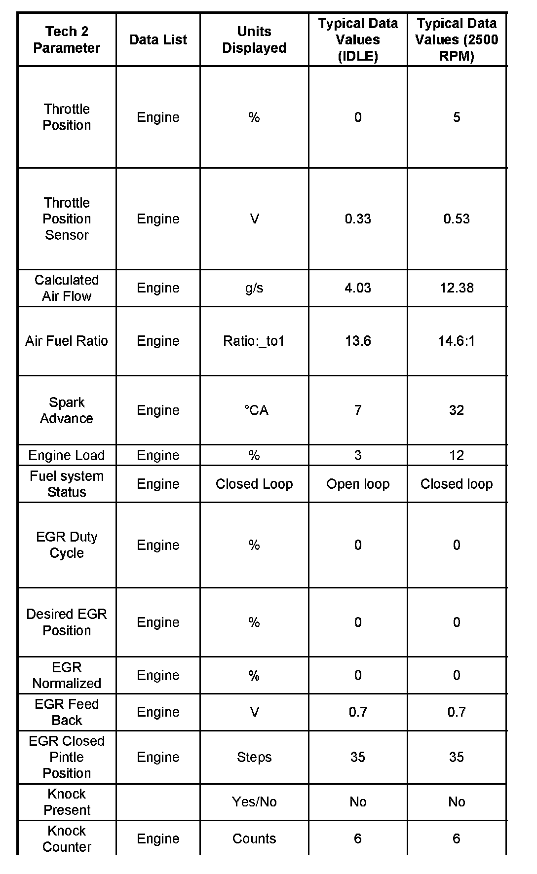 Use the Typical Scan Data Values Table only after the On-Board Diagnostic System Check has been completed, no DTC(s) were noted, and you have determined that the on-board diagnostics are functioning properly. Tech 2 values from a properly-running engine may be used for comparison with the engine you are diagnosing. The typical scan data values represent values that would be seen on a normally-running engine.