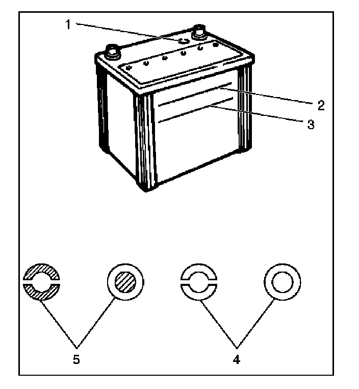 The fluid level should be between the upper level line (2) and lower level line (3) on side of battery.