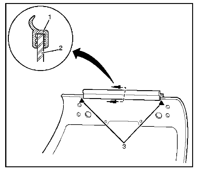 1. Attach the upper seal (1) to the hatchgate glass (2) indicated portion (3) so that the end of the glass contacts the bottom of the upper seal.