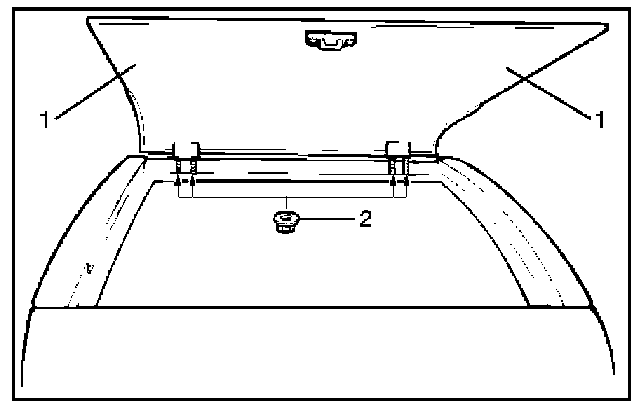 2. When installing the hatchgate glass, first attach the hinge to the hatchgate glass. Align the stud of the hinge to the hole at body while supporting the hatchgate glass with two people at indicated positions (1), and then partially tighten the hinge to body nut (2).