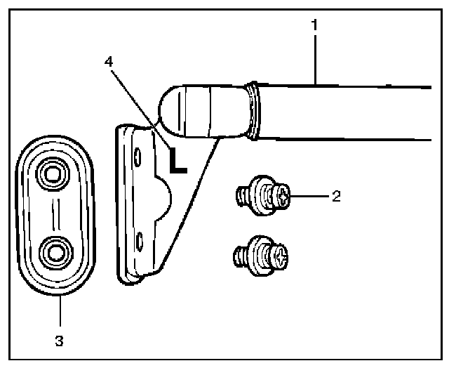 3. When installing gas stay assembly (1), first install the gas stay onto the rear quarter panel with fixing screw (2) and fastener (3) and then attach the gas stay upper end to the ball stud by spreading the retainer with screwdriver, etc. Gas stay assemblies for left and right sides differ from each other (The letter (4) L (LH) or R (RH) is embossed on the gas stay assembly.)