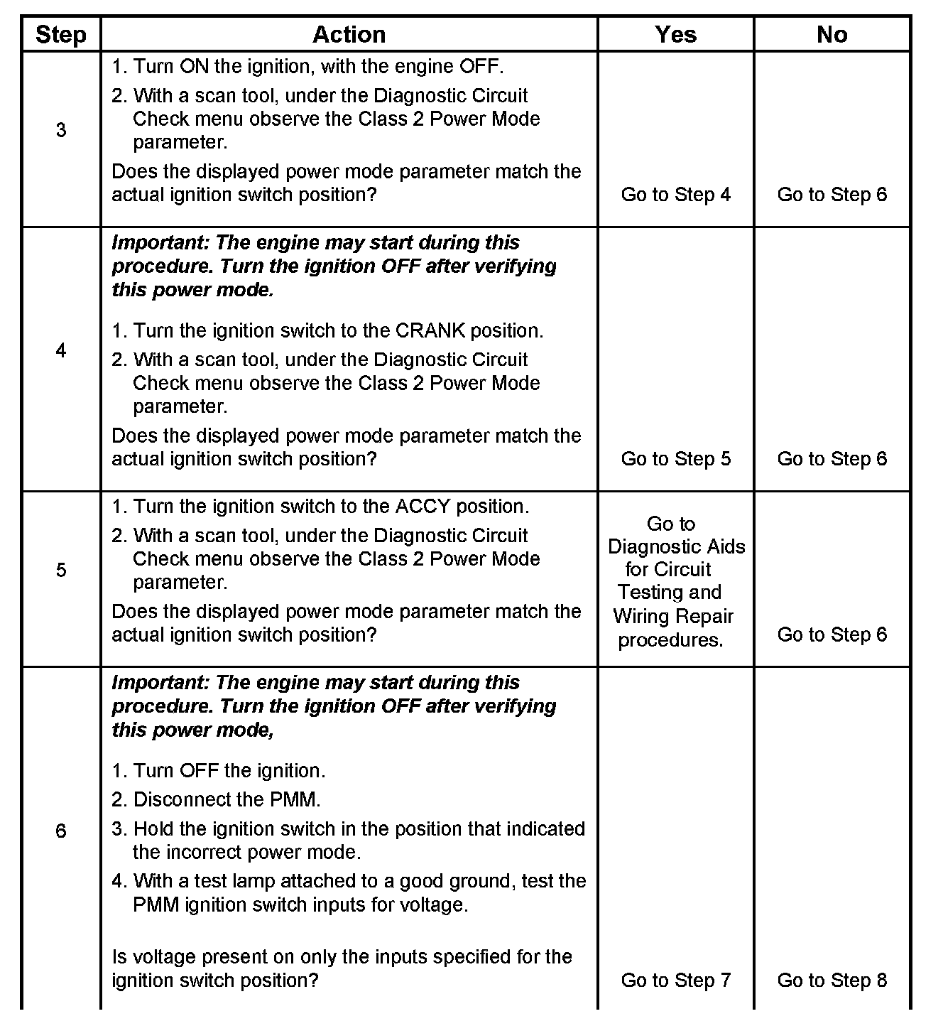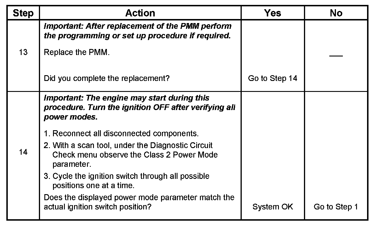 Normal vehicle class 2 communications and module operations will not begin until the system power mode has been identified. Discrete wires from the ignition switch contacts are monitored by the power mode master (PMM) module in order to determine the correct power mode. The PMM communicates the system power mode to all class 2 modules on the class 2 serial data line. Refer to Body Control System Description and Operation to identify which module is the PMM and the applicable power mode look up table.