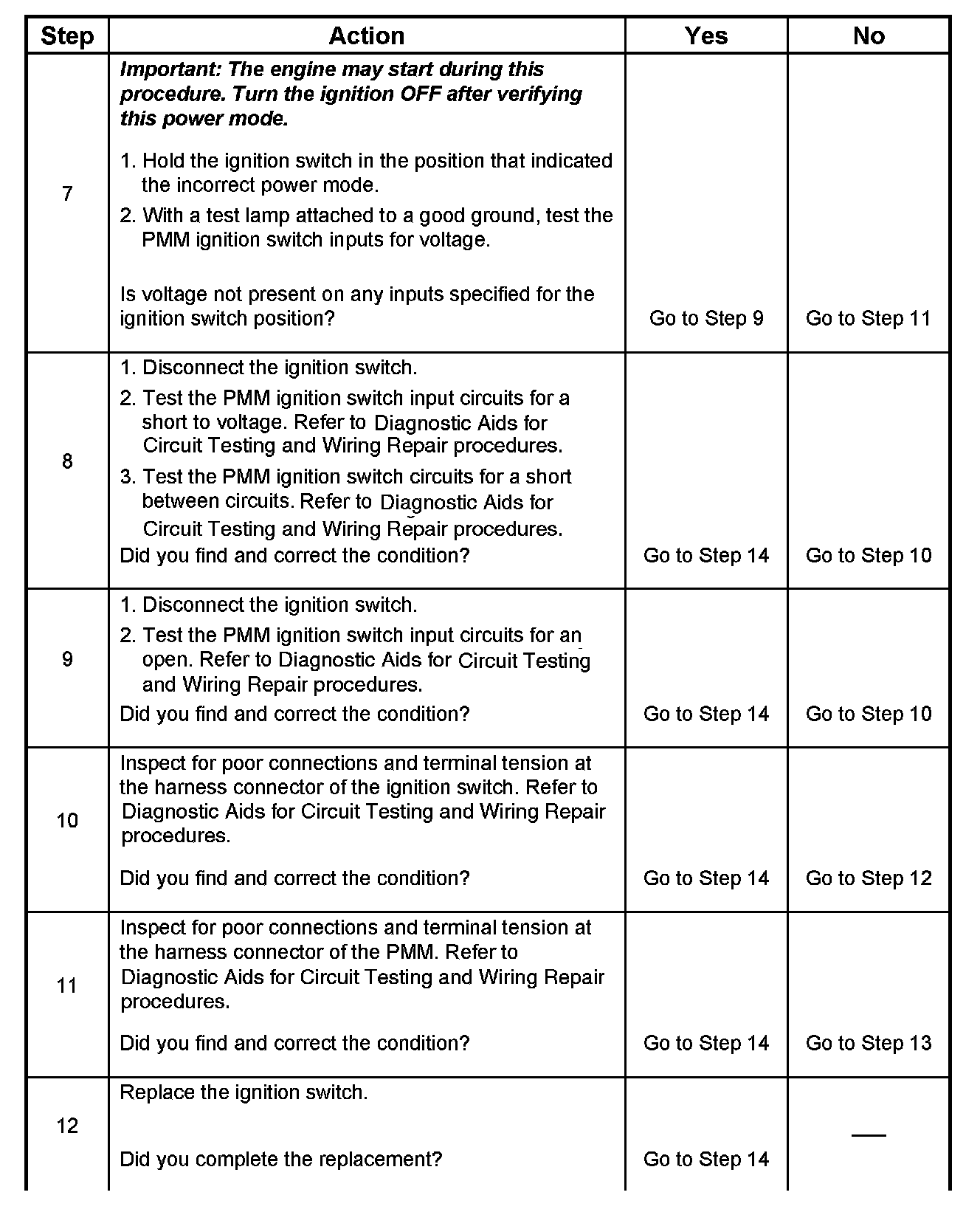 The numbers below refer to the step numbers on the diagnostic table.