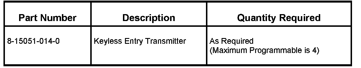 To install keyless entry, reprogram the Liftgate Module and Truck Body Control Module using Isuzu TIS 2000 and select a calibration for keyless entry. Refer to Service Programming System (SPS) in the Service Manual. As always, make sure your TECH2 is updated with the latest software version. Then program the new transmitters. Refer to Keyless Entry in the Service Manual for further information.