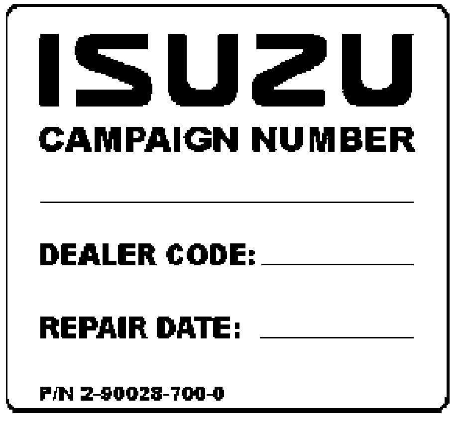 Affix the campaign label P/N 2-90028-700-0 adjacent to the manufacturer, identification label located inside the drivers door. Using a ballpoint pen, fill in the label with campaign number 05V-198, Isuzu dealer code and repair date.