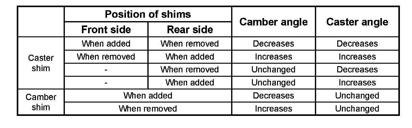 Note: Difference of the caster shim front/rear thickness should be 3.6 mm (0.142 inch) or less. Overall thickness of caster shim and camber shim should be 10.8 mm (0.425 inch) or less.
