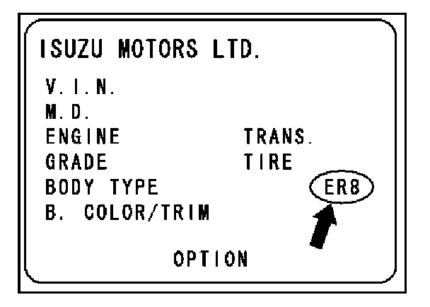 Destination code can be read from ID Plate affixed on vehicles, while on VIN plate the destination code is described at the right-hand edge of Body Type line. In Fig.-3, the destination code can be read as "ER8 (USA)".