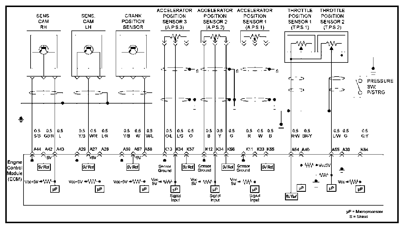- The acceleration position (AP1) sensor circuit provides a voltage signal relative to acceleration pedal angle.