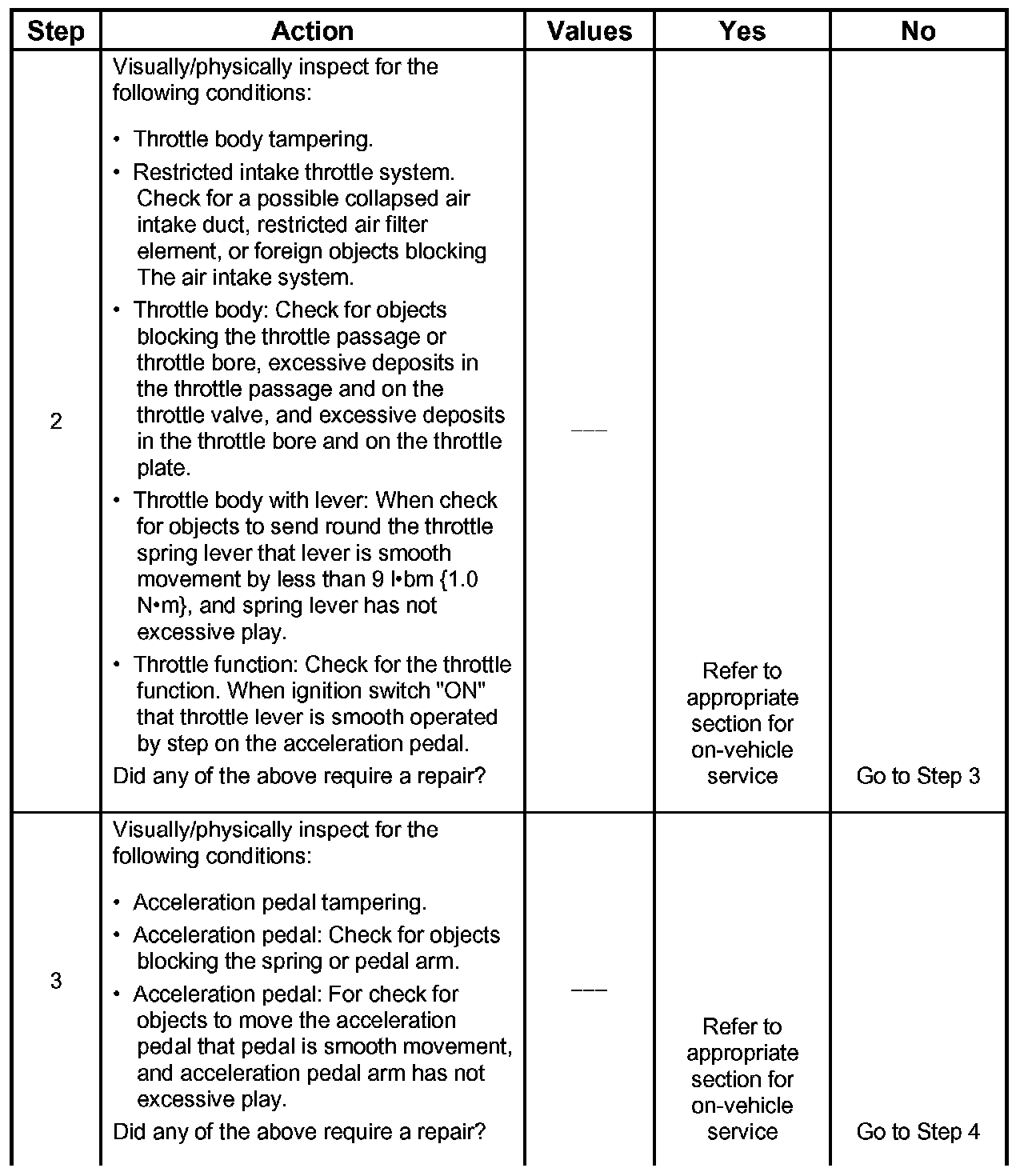 3. Visually/physically inspect for the following acceleration pedal conditions.