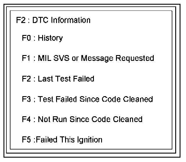 This selection will display only DTCs that have failed the last time the test run. The last test may have run during a previous ignition cycle if a type A or type B DTC is displayed. For type C and type D DTCs, the last failure must have occurred during the current ignition cycle to appear as Last Test Fail.