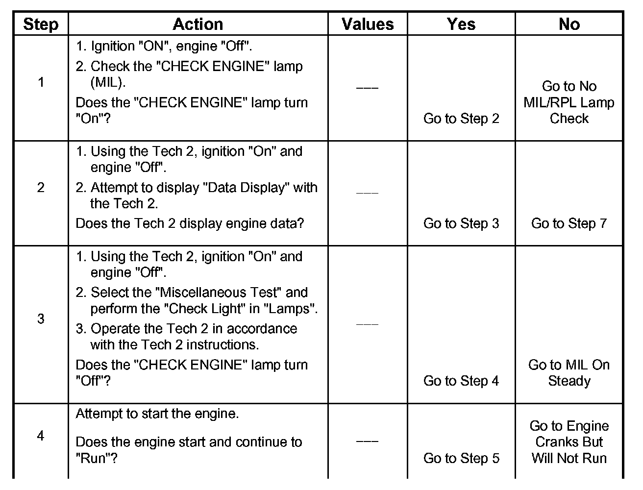 1. The Check Engine Lamp (MIL) should be ON steady with the ignition "On", engine "Off". If not, "No Check Engine Lamp (MIL)" chart should be used to isolate the malfunction.