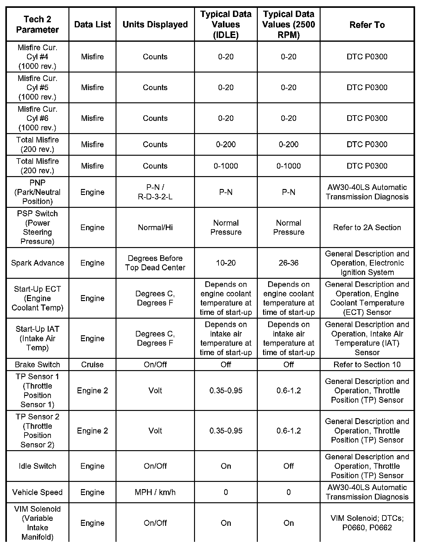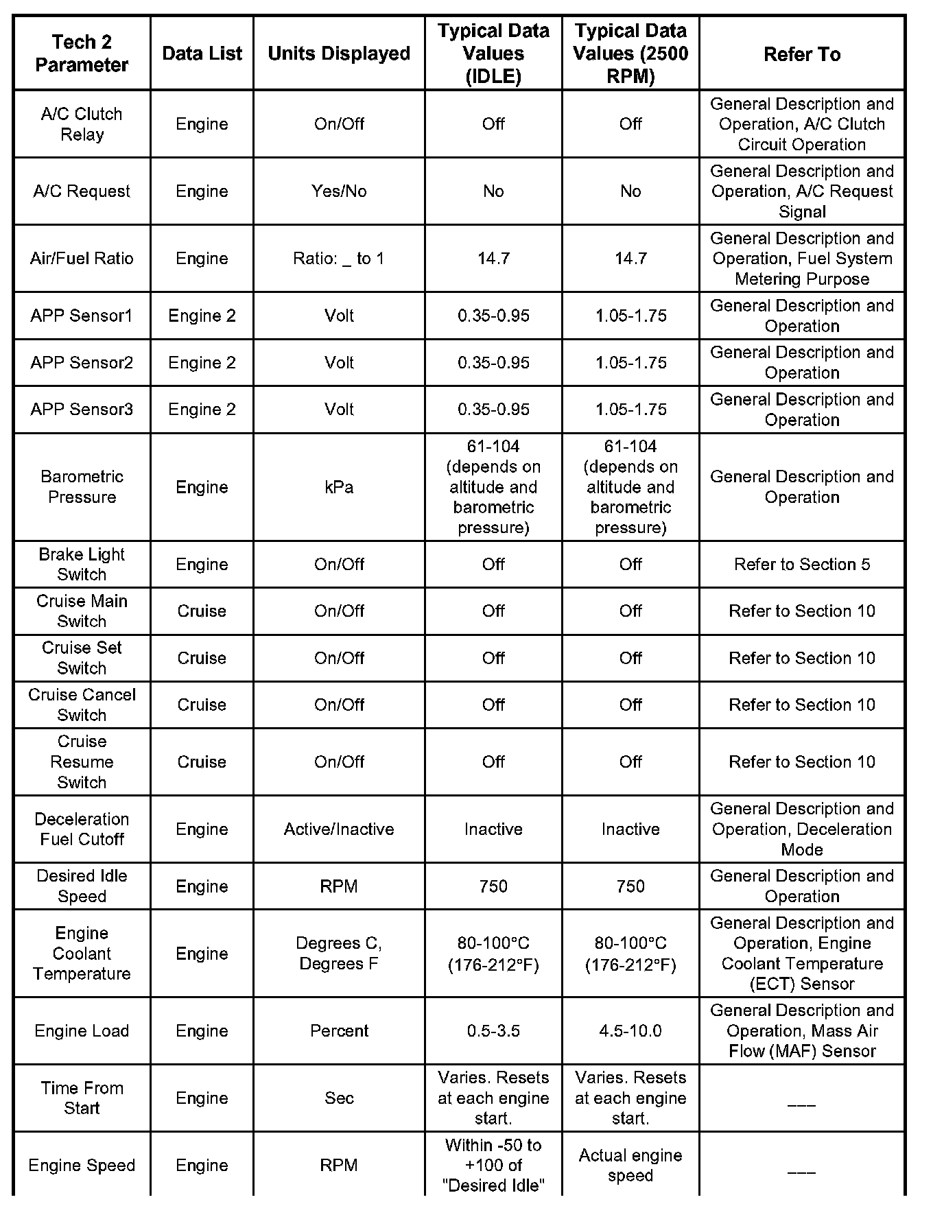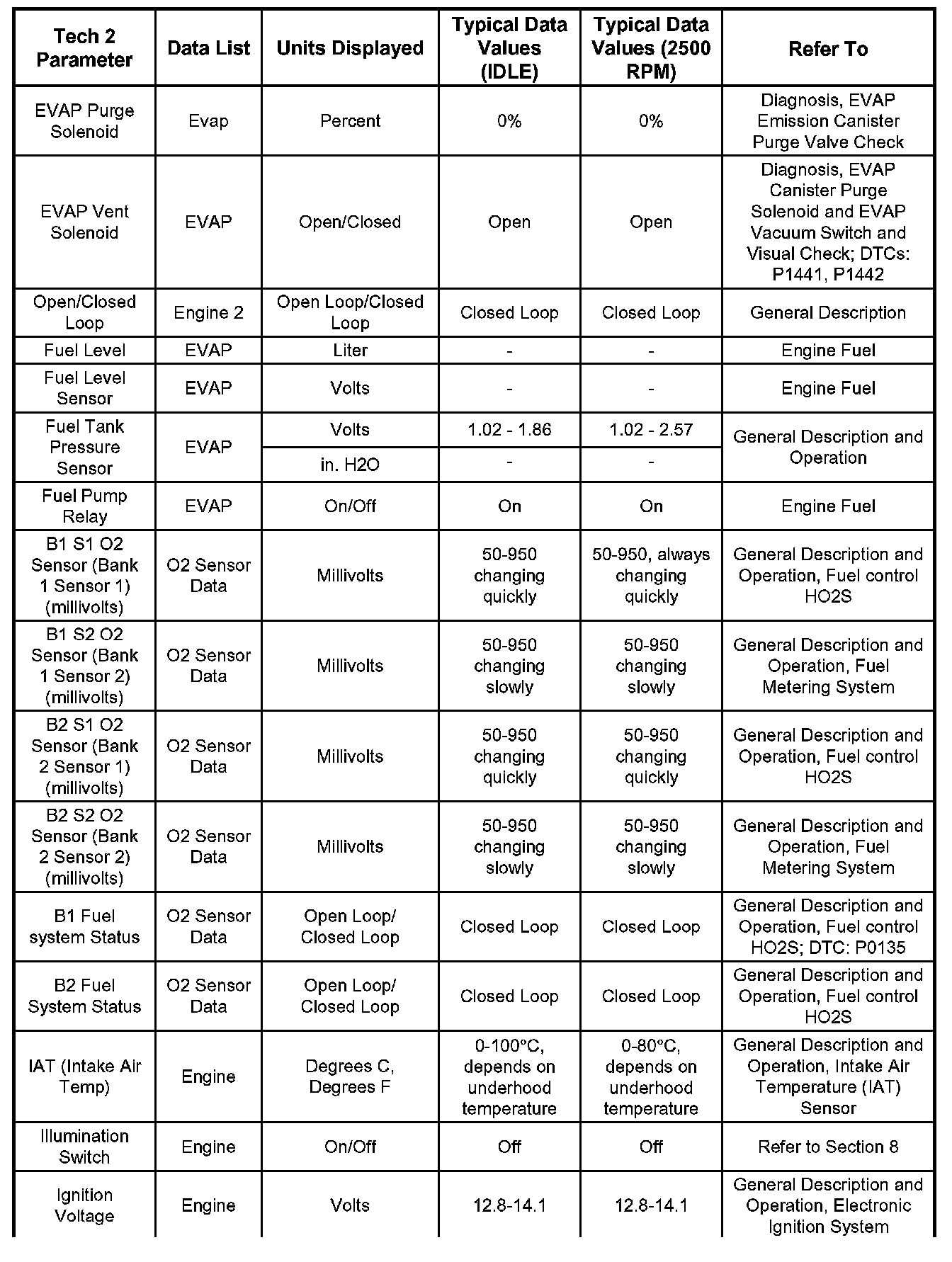 Only the parameters listed are referred for use in diagnosis. For further information on using the Tech 2 to diagnose the ECM and related sensors, refer to the applicable reference section listed . If all values are within the typical range described, refer to the Symptoms section for diagnosis.
