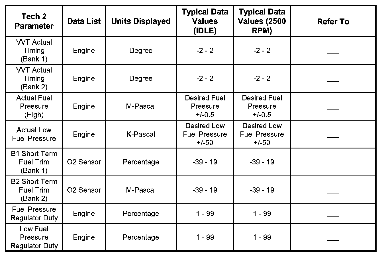 Typical Scan Data ValuesUse the Typical Scan Data Values Table only after the On-Board Diagnostic System Check has been completed, no DTC(s) were noted, and you have determined that the on-board diagnostics are functioning properly. Tech 2 values from a properly-running engine may be used for comparison with the engine you are diagnosing. The typical scan data values represent values that would be seen on a normally-running engine.