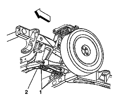 5. Adjust the caster and the camber angle by repositioning the lower control arm (2) until the specifications have been met. When the adjustments are complete, hold the lower control arm in position so that the specifications do not change while tightening the lower control arm adjustment bolts.