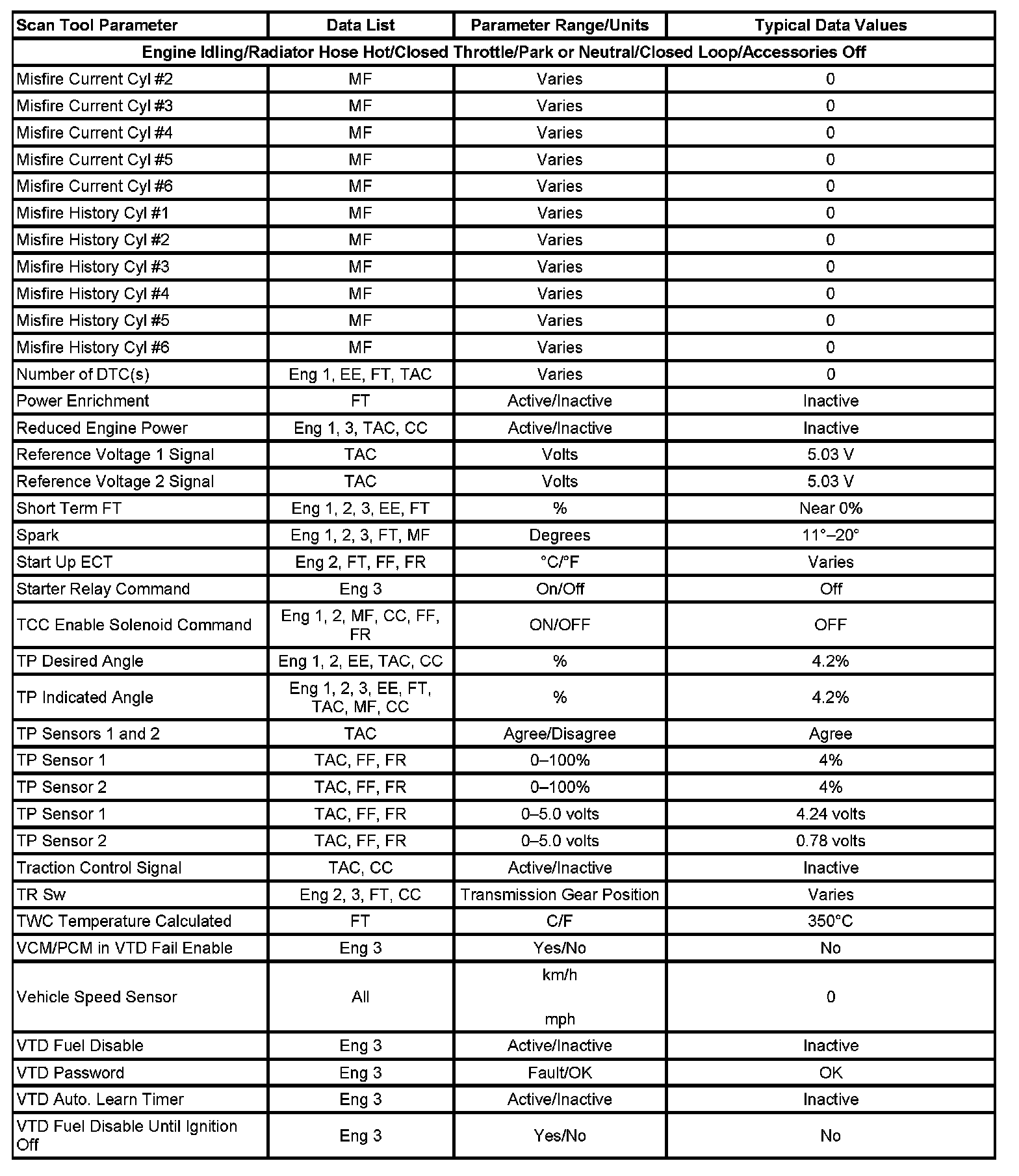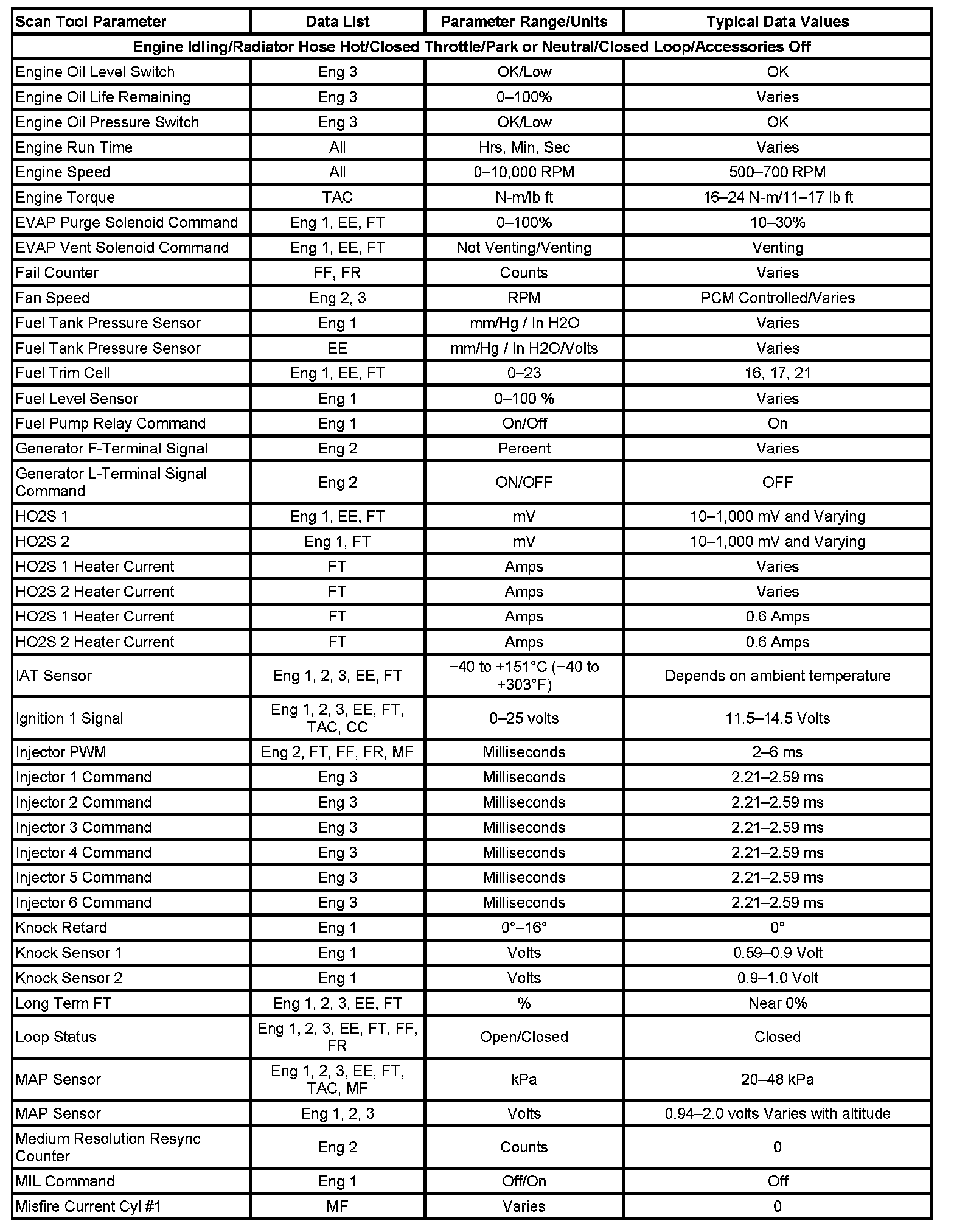 The Engine Scan Tool Data List contains all engine related parameters that are available on the scan tool. The list is arranged in alphabetical order. A given parameter may appear in any one of the data lists, and in some cases may appear more than once, or in more than one data list in order to group certain related parameters together.