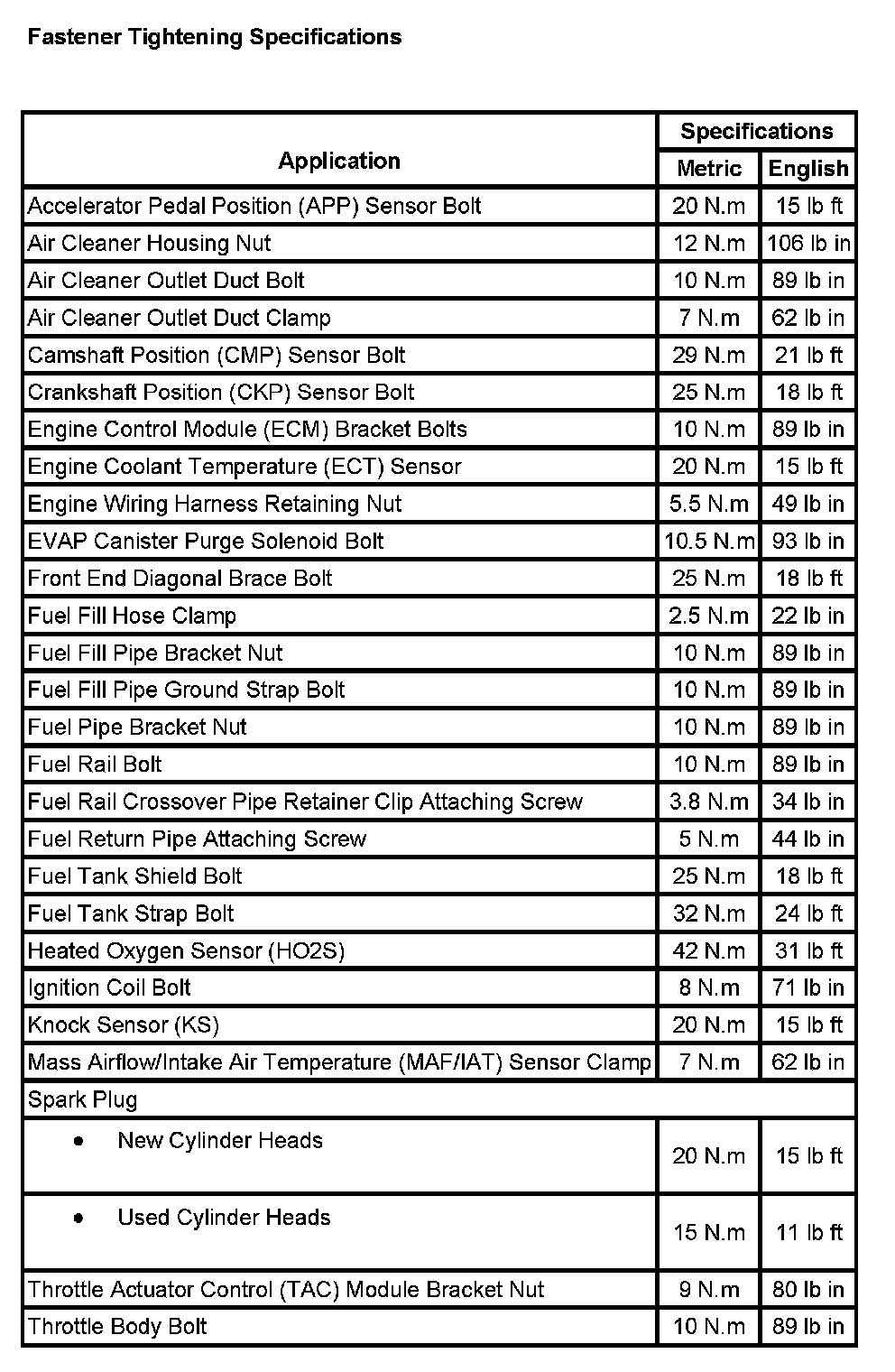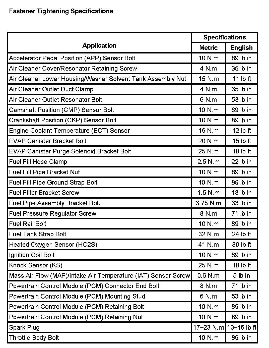 Fastener Tightening Specifications: