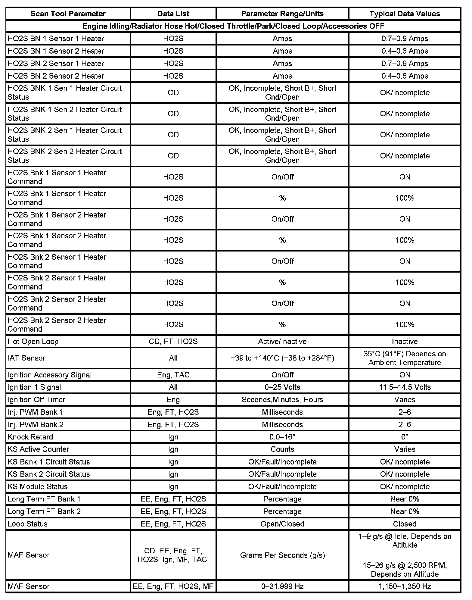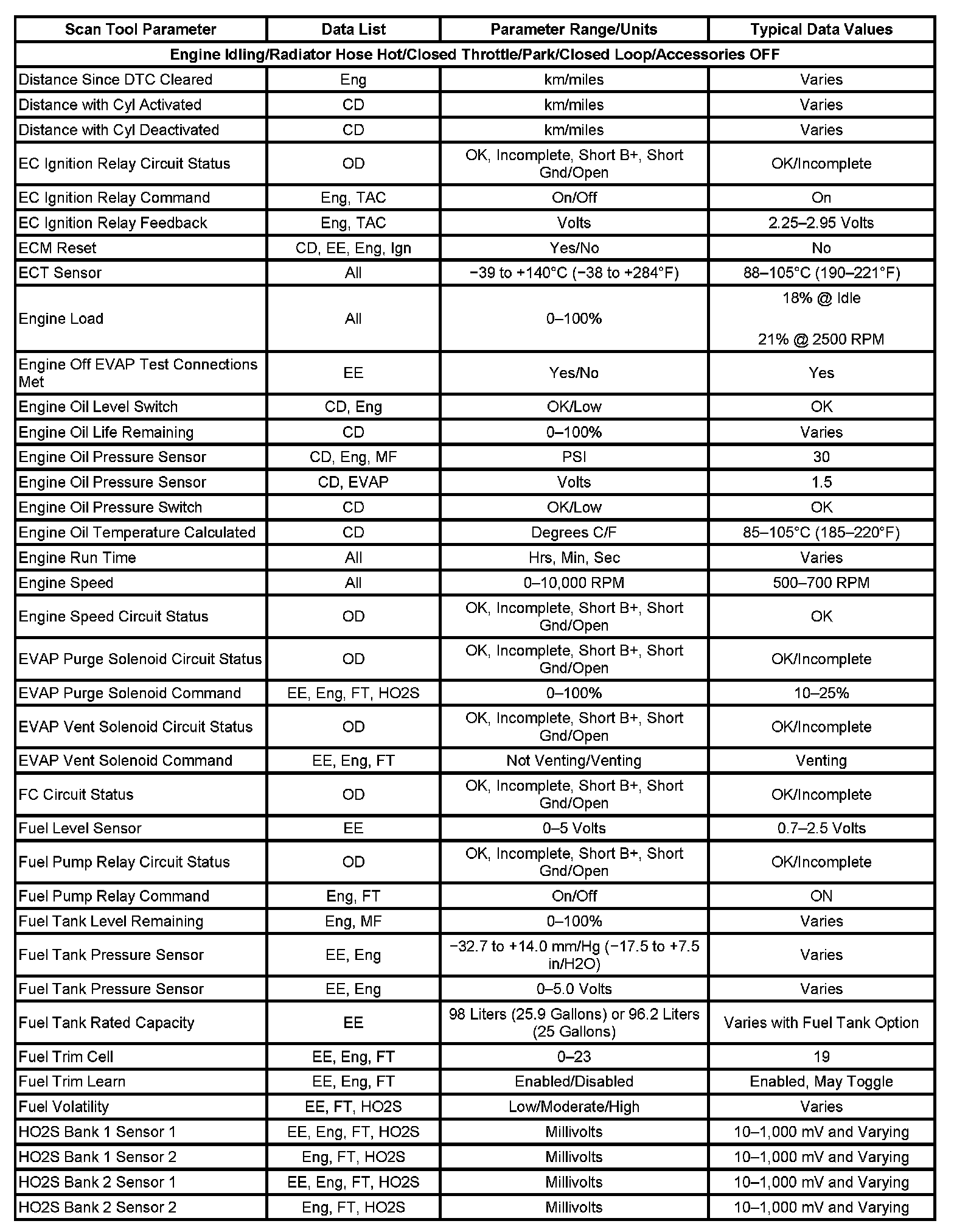 Scan tool values from a properly running engine may be used for comparison with the engine you are diagnosing. The Engine Scan Tool Data List represents values that would be seen on a normal running engine at idle.