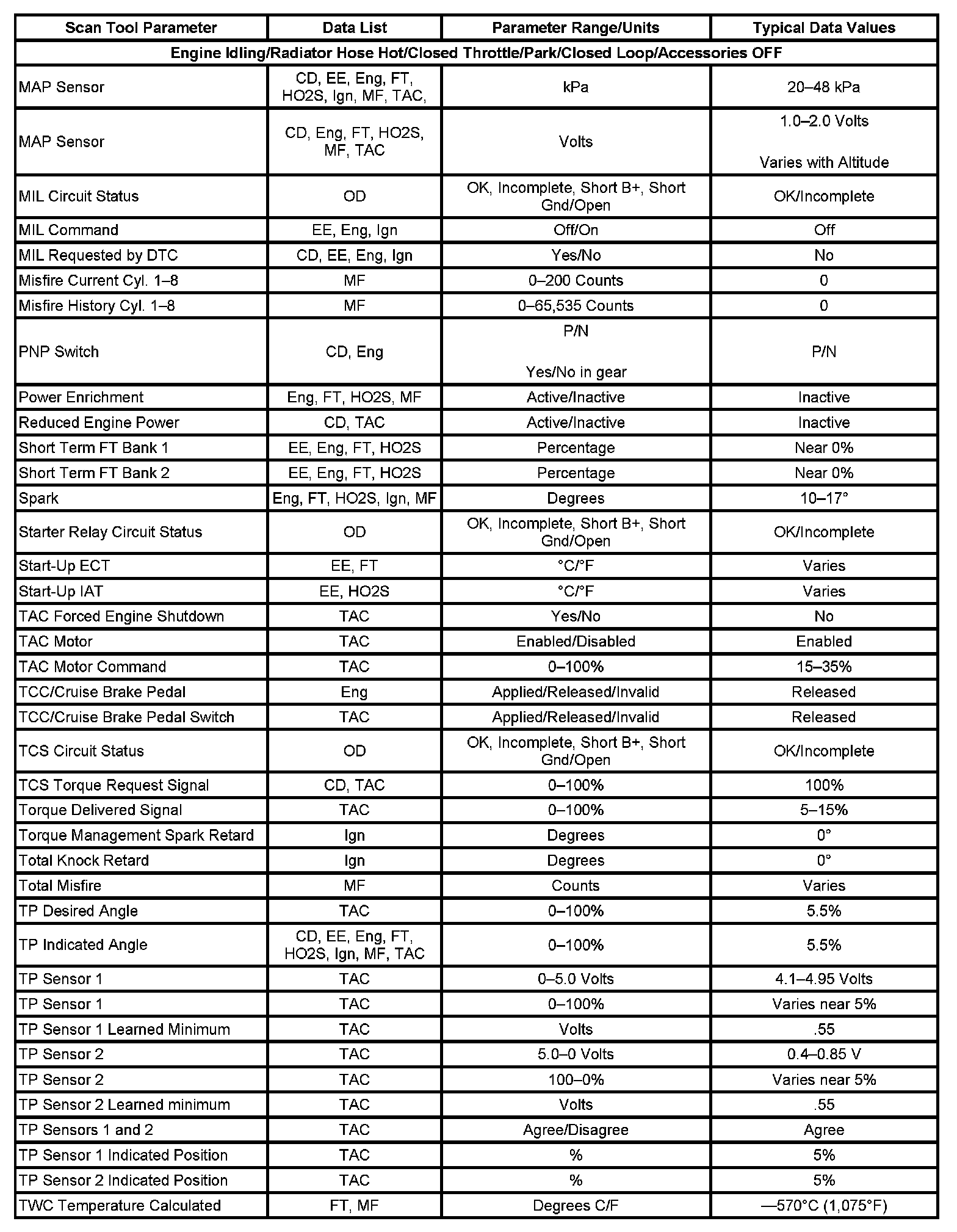 The column labeled Data List indicates where a parameter can be located on the scan tool. Refer to the scan tool operating manual for the exact locations of the data lists. The following is a description of each term listed: