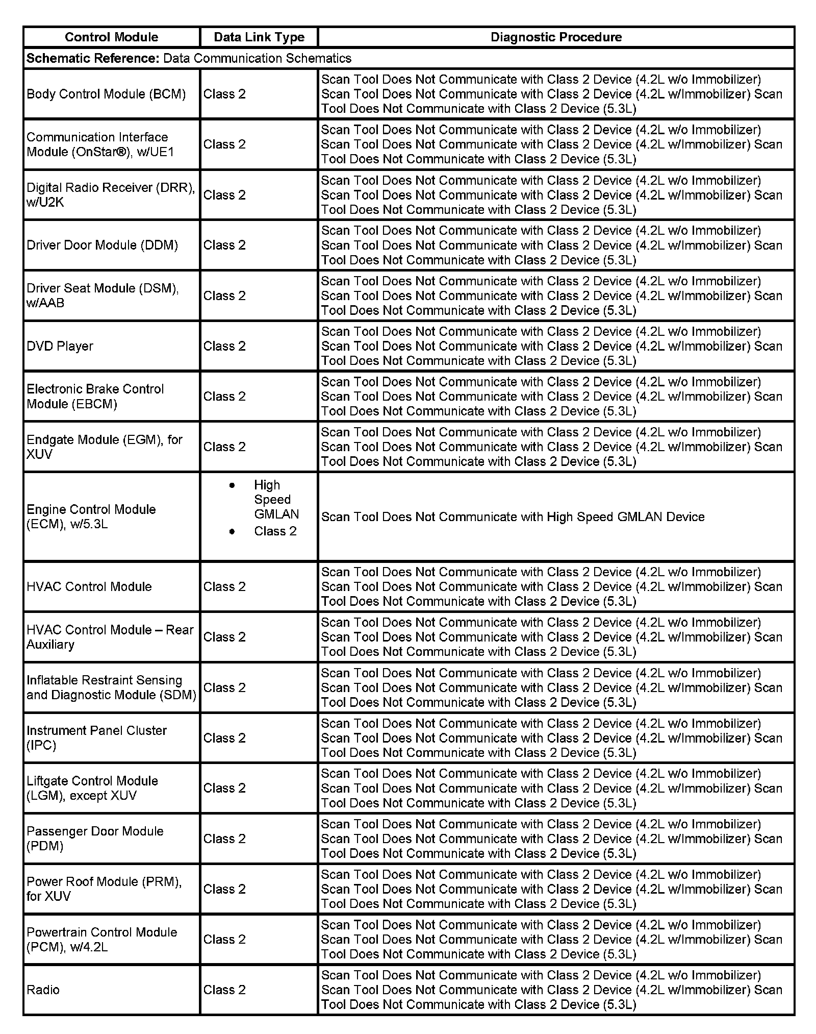 This table identifies which serial data link that a particular module uses for in-vehicle data transmission. Some modules may use more than one data link to communicate. Some modules may have multiple communication circuits passing through them without actively communicating on that data link. This table is used to assist in correcting a communication malfunction. For the description and operation of these serial data communication circuits refer to Data Link Communications Description and Operation.