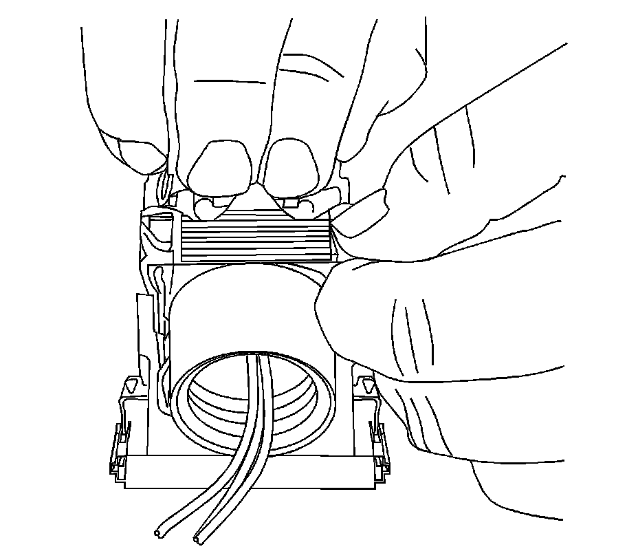 6. Remove the nose piece by inserting a small flat-blade tool into the slots on both ends of the connector body. Gently pry the nose piece out of the connector. J 38125-216 can also be used to remove the nose piece.