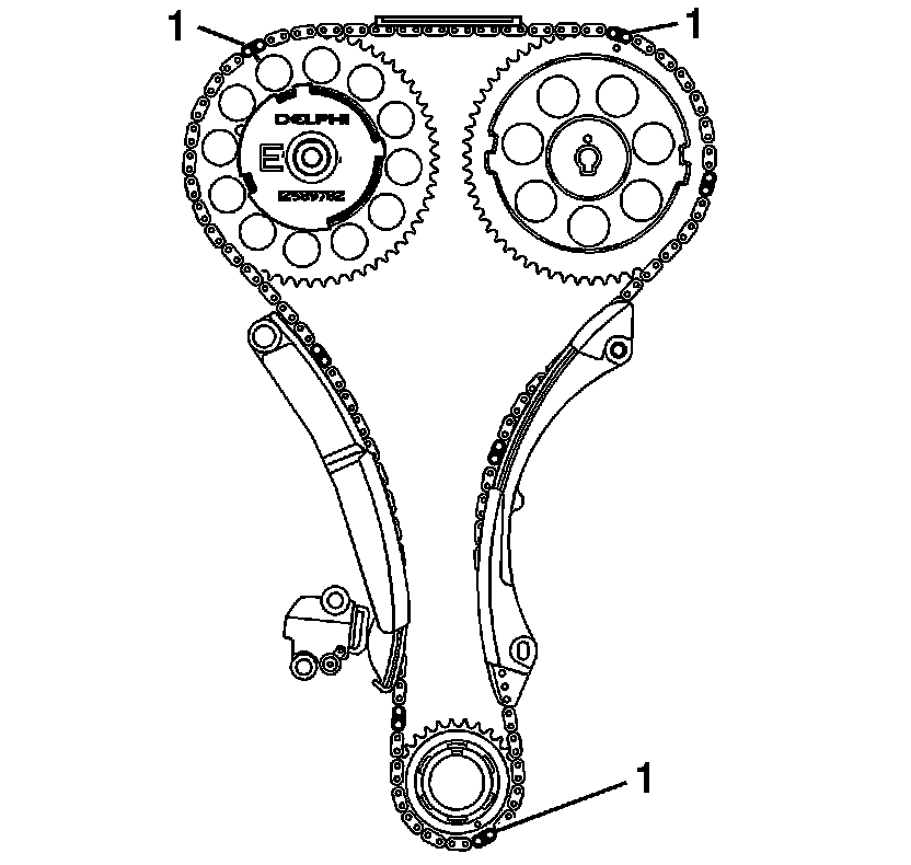 The dark links (1) on the chain should be aligned with marks on sprockets as shown.