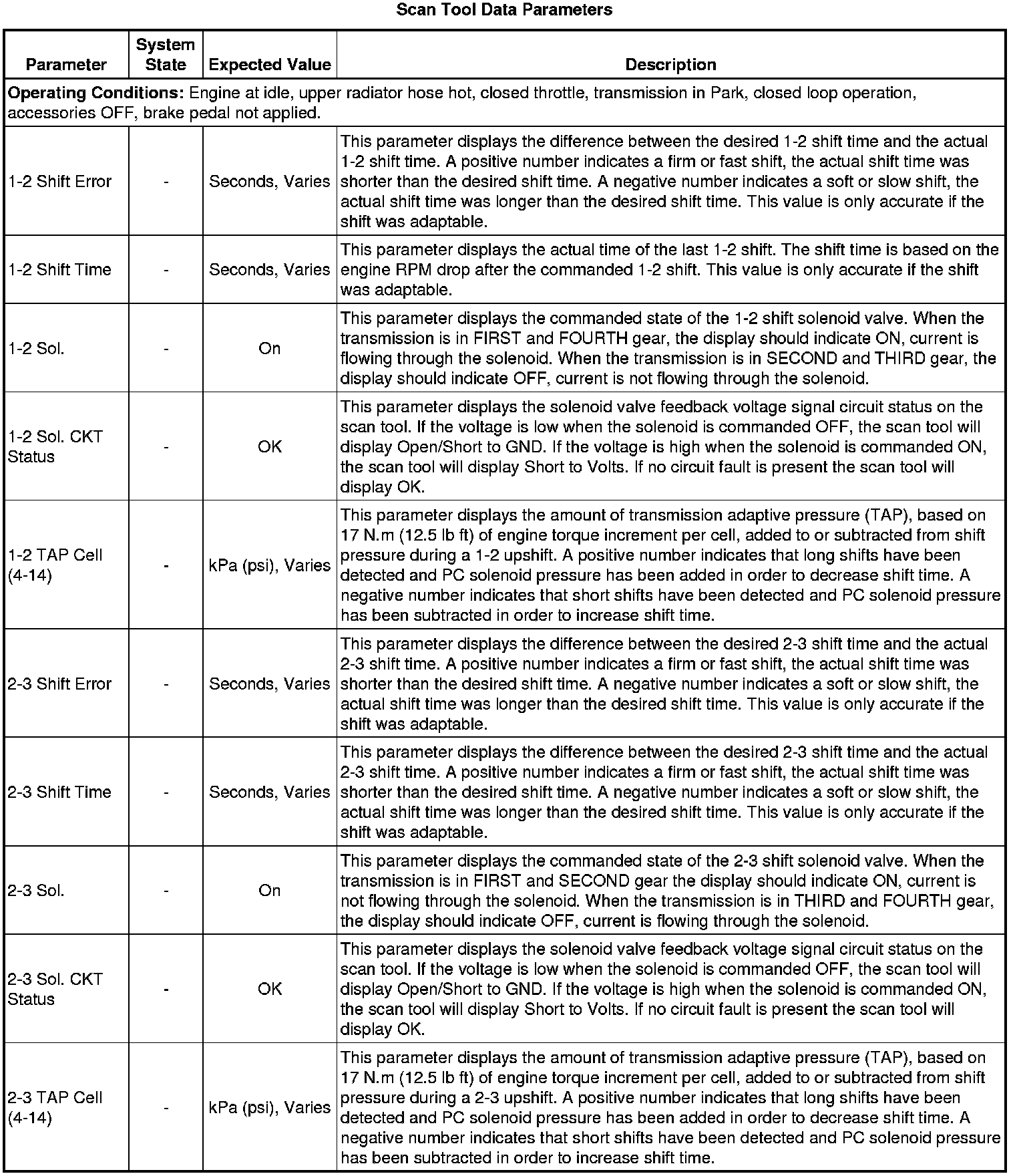 The scan tool values from a properly functioning transmission may be used for comparison with the transmission you are diagnosing. The values below represent a typical display recorded from a properly functioning system.