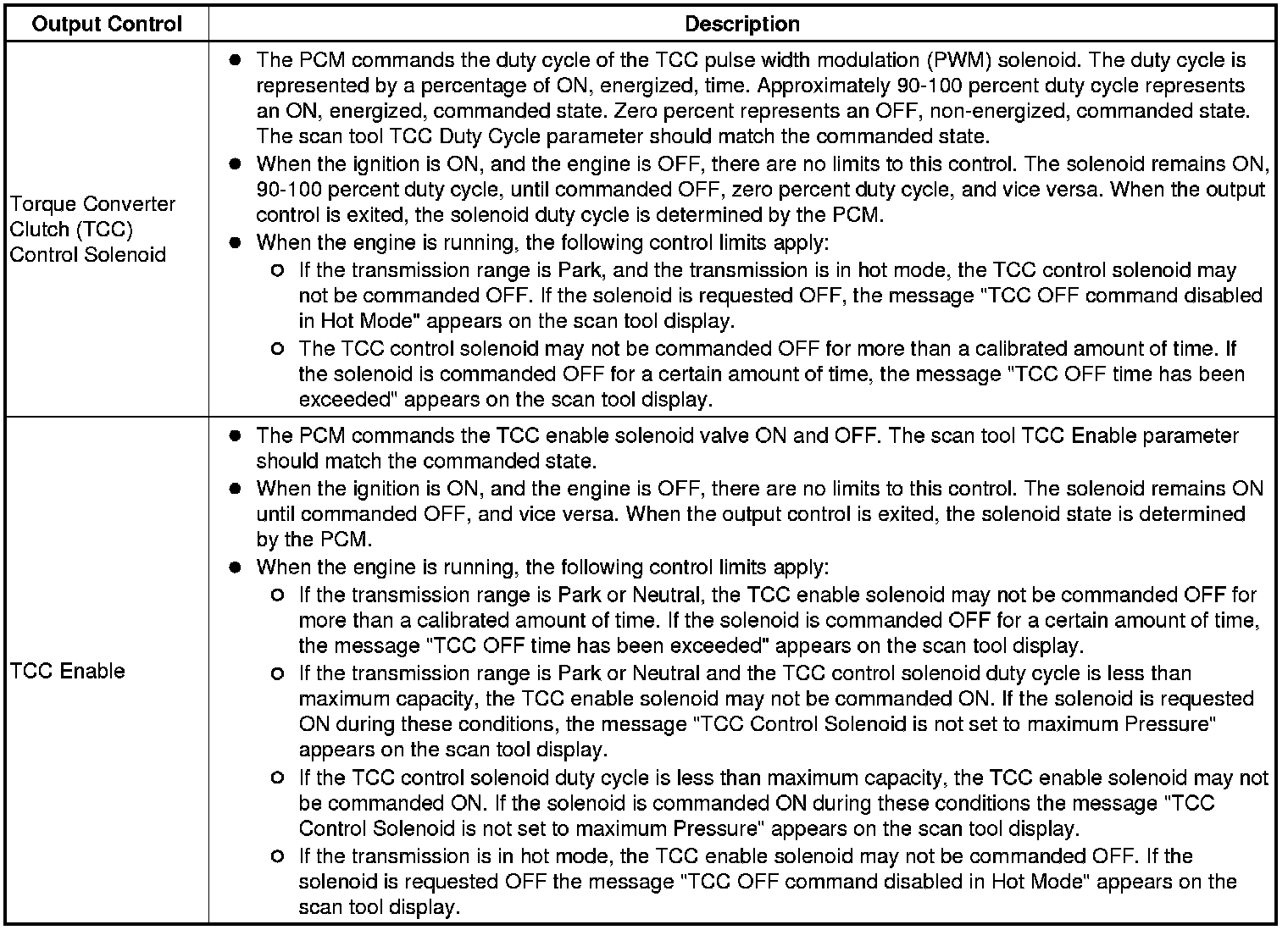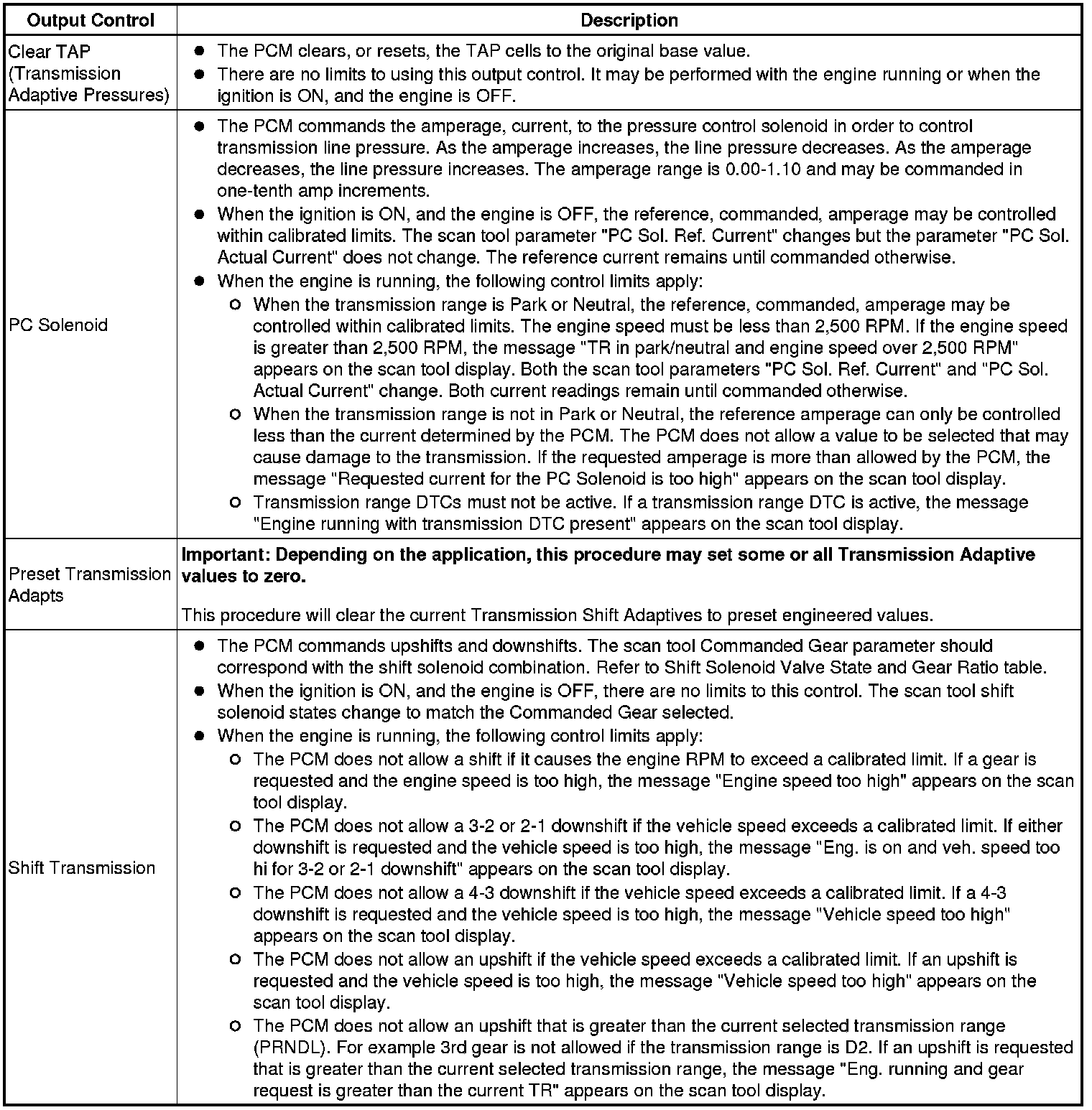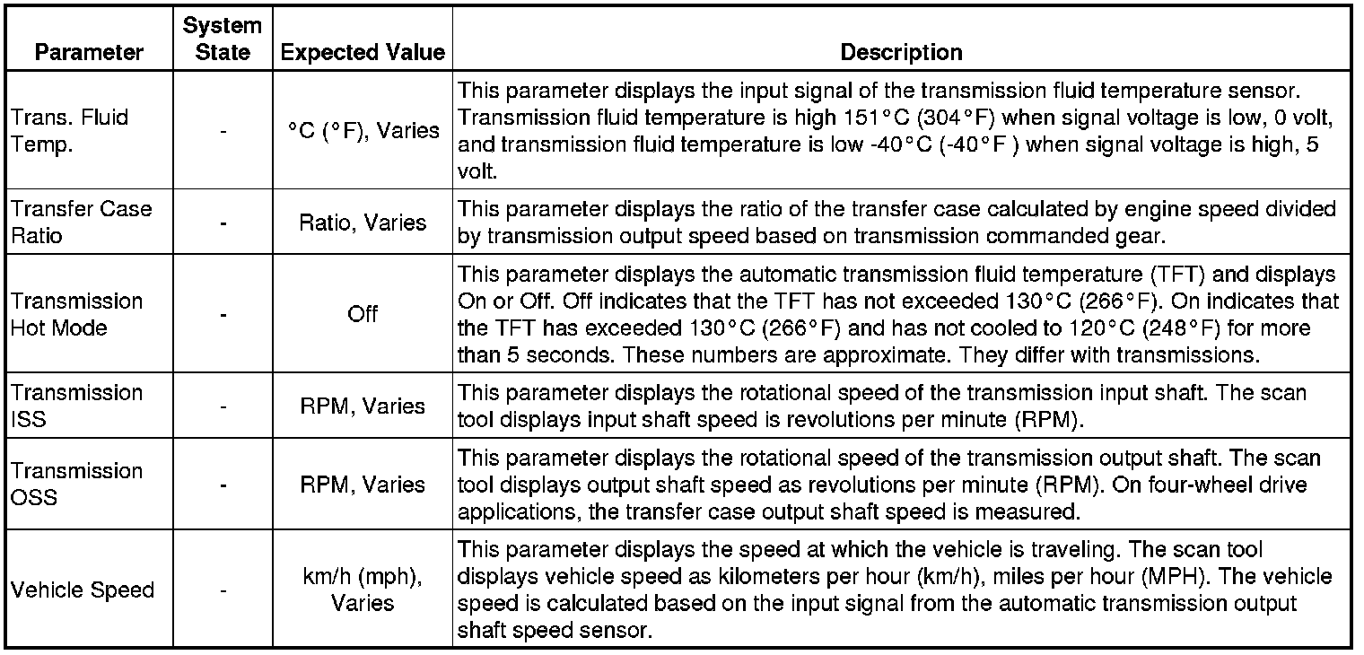 The Transmission Control Module Scan Tool Data List contains all transmission related parameters that are available on the scan tool. The list is arranged in alphabetical order. A given parameter may appear in any one of the data lists, and in some cases may appear more than once, or in more than one data list in order to group certain related parameters together.