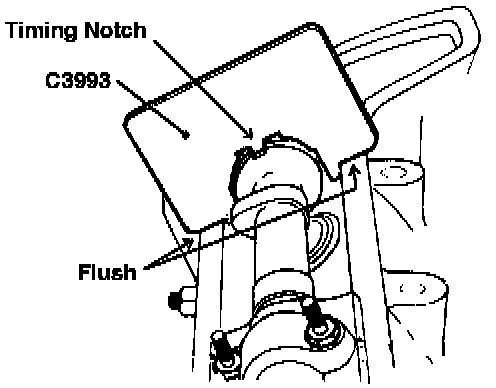 To place the Jaguar 4.2L engine "in time" the No. 6 (front) cylinder must be at TDC and the timing notch on each camshaft must align with service tool C3993. When these conditions are met the engine is said to be "in time".