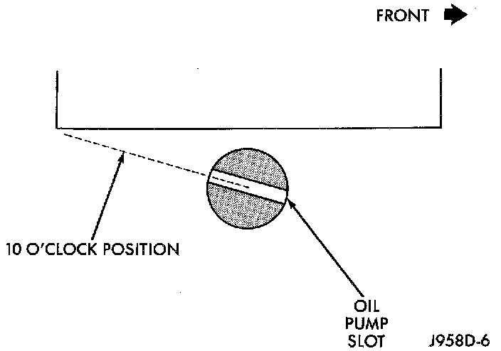 14. Observe slot in oil pump gear through hole on side of engine. It should be slightly before (counterclockwise of) 10 o'clock position.