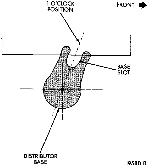 - centerline of slot at base of distributor is aligned to centerline of distributor holddown bolt hole on engine. In this position, the holddown bolt should easily pass through slot and into engine.