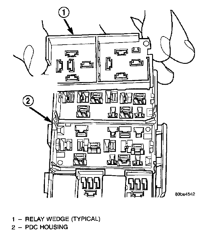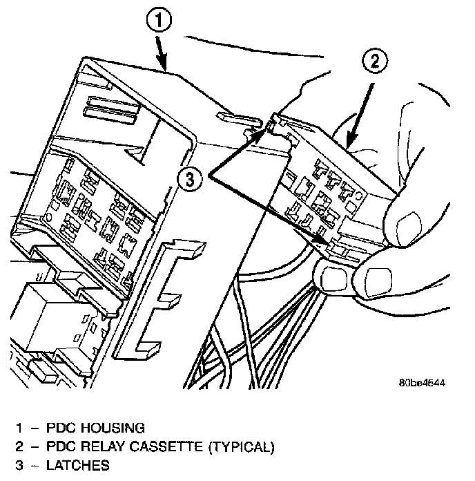 CAUTION: Proper care must be taken to be certain that the wiring and terminals from the faulty PDC relay cassette are installed in the correct terminal cavities of the replacement relay cassette. To prevent mistakes it is recommended that the wiring and terminals be removed from the faulty relay cassette one cavity at a time, repaired or spliced as necessary, then installed securely into the correct cavity of the replacement relay cassette. If you are not absolutely certain into which cavity a terminal should be installed, refer to Power Distribution circuit diagrams covering the PDC.