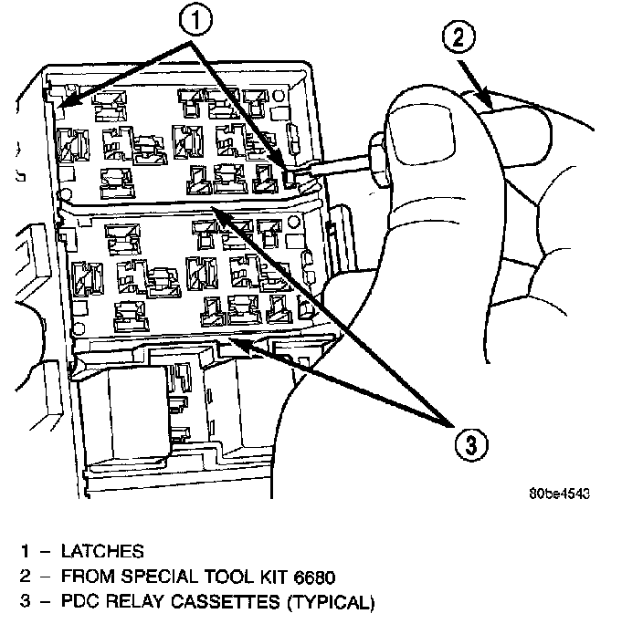 2. From the top of the PDC housing, use a small screwdriver or a terminal pick tool (Special Tool Kit 6680) to release the two latches that secure the relay cassette in the PDC.