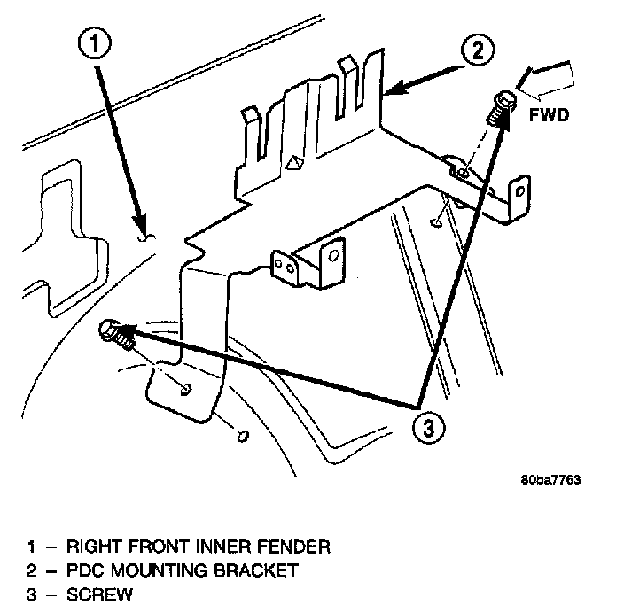 2. Install and tighten the two screws that secure the PDC mounting bracket to the right front inner fender. Tighten the screws to 8.1 Nm (72 in. lbs.).