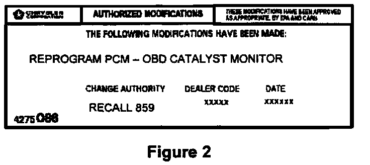 Type or print (with a ballpoint pen) the recall number, dealer code and date on the Authorized Modifications Label (Figure 2). Then attach the label near the VECI label.