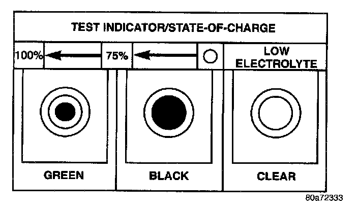 - Black or Dark - Indicates 0% to 75% battery state-of-charge. The battery is inadequately charged and must be charged until a green indication is visible in the sight glass (12.4 volts or more), before the battery is tested further or returned to service. Refer to Battery Charging procedures. Also refer to Abnormal Battery Discharging for the possible causes of the discharged battery condition.