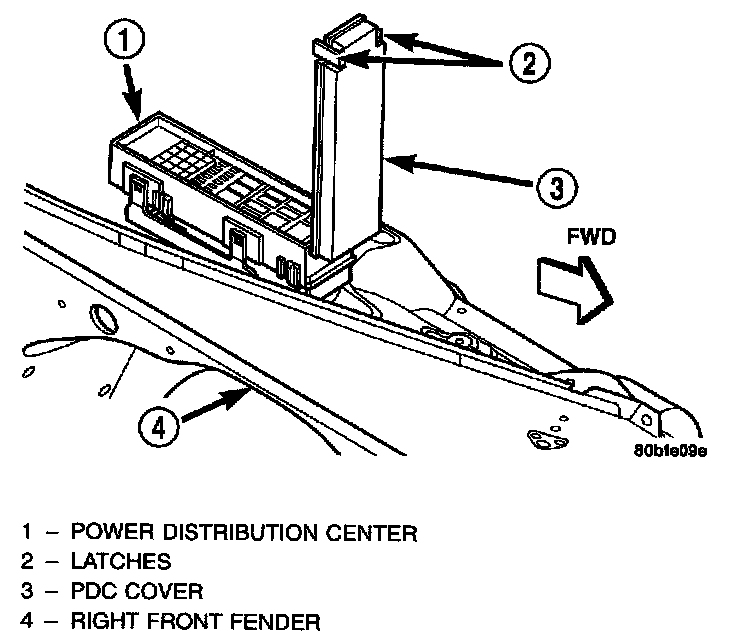 The molded plastic PDC housing is located on the right side of the engine compartment, forward of the battery on the top of the right front inner fender shield.
