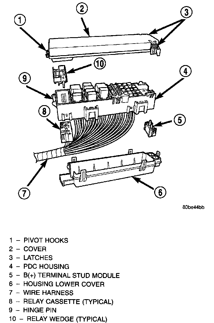 The Power Distribution Center (PDC) cover, the PDC housing lower cover, the PDC relay wedges, the PDC relay cassettes and the PDC B(+) terminal stud module are available for service replacement. The PDC cover can be simply unlatched and removed from the PDC housing without the PDC being removed or disassembled. Service of the remaining PDC components requires that the PDC be removed from its mounting and disassembled.